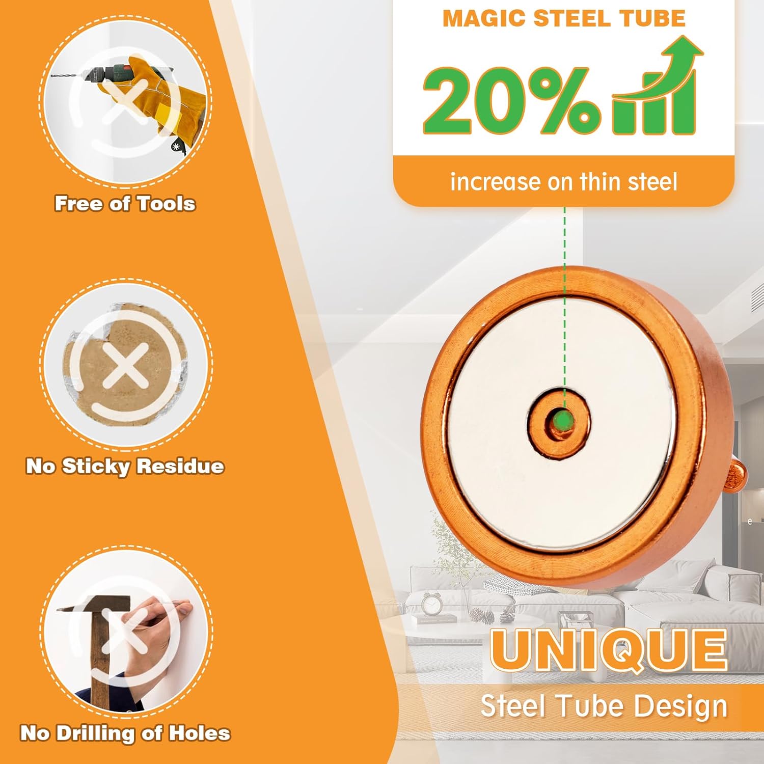 - ✔MAGIC STEEL TUBE DESIGN - Unique design of steel tube inside the base of magnetic hooks greatly increases the attractive force , especially on thin steel! It increase approximately 20% force comparing those none-tube magnets. it solves the problem of weak force on thin steel. Permanent magnetic hook with magic steel tube, strong magnetism lasts forever!