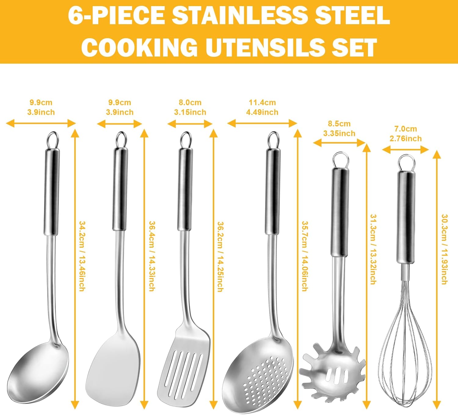 6-Piece Kitchen Cooking Utensils Set, Stainless Steel Kitchen Utensils with Suspendable Handle, Spatula, Slotted Turner, Soup Ladle, Slotted Spoon, Whisk, Pasta Server, Dishwasher Safe