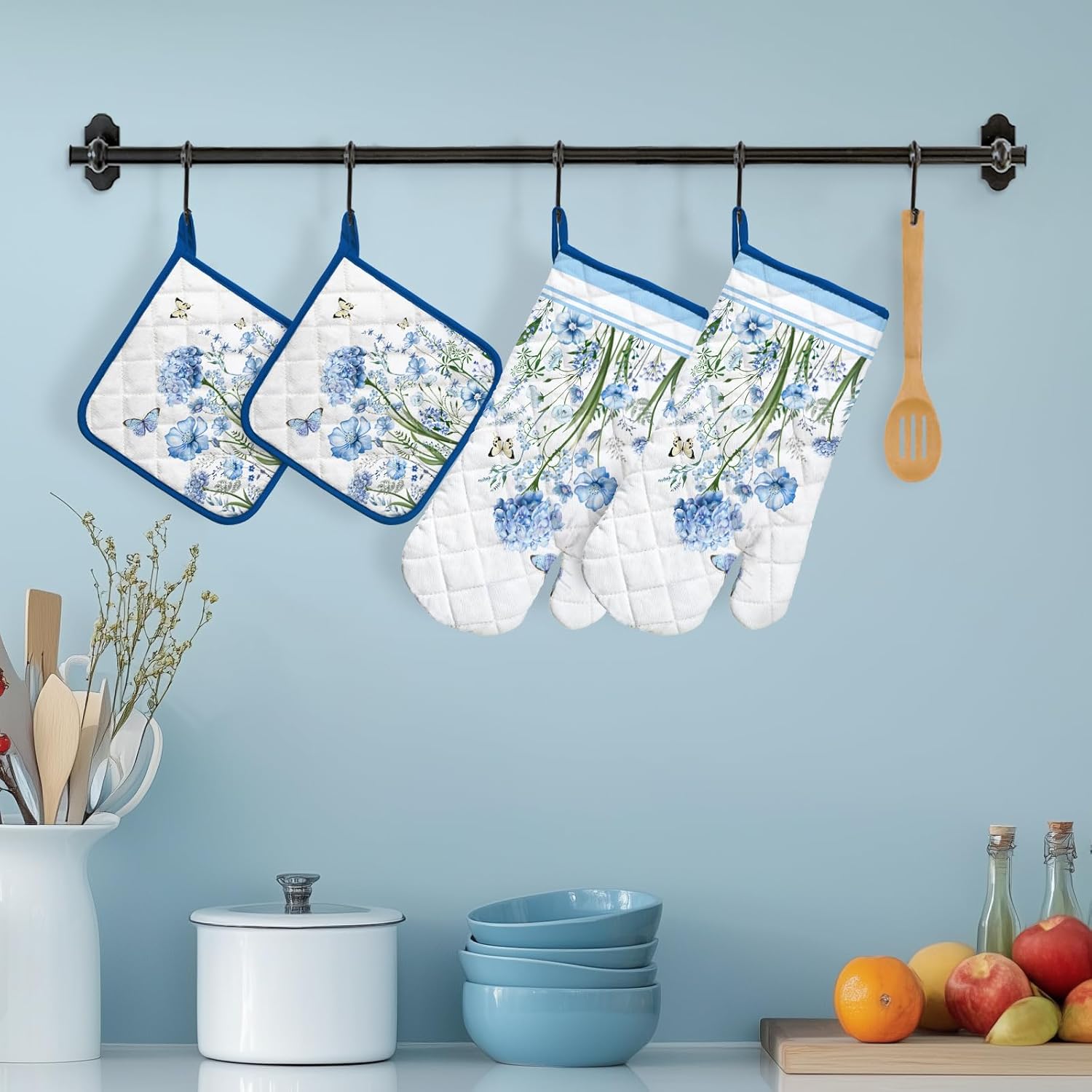 Blue Floral Oven Mitts and Pot Holders Sets 4Pcs, 100% Cotton Heat Resistant, Extra Long Oven Gloves Potholder for Kitchen Cooking Baking Decoration