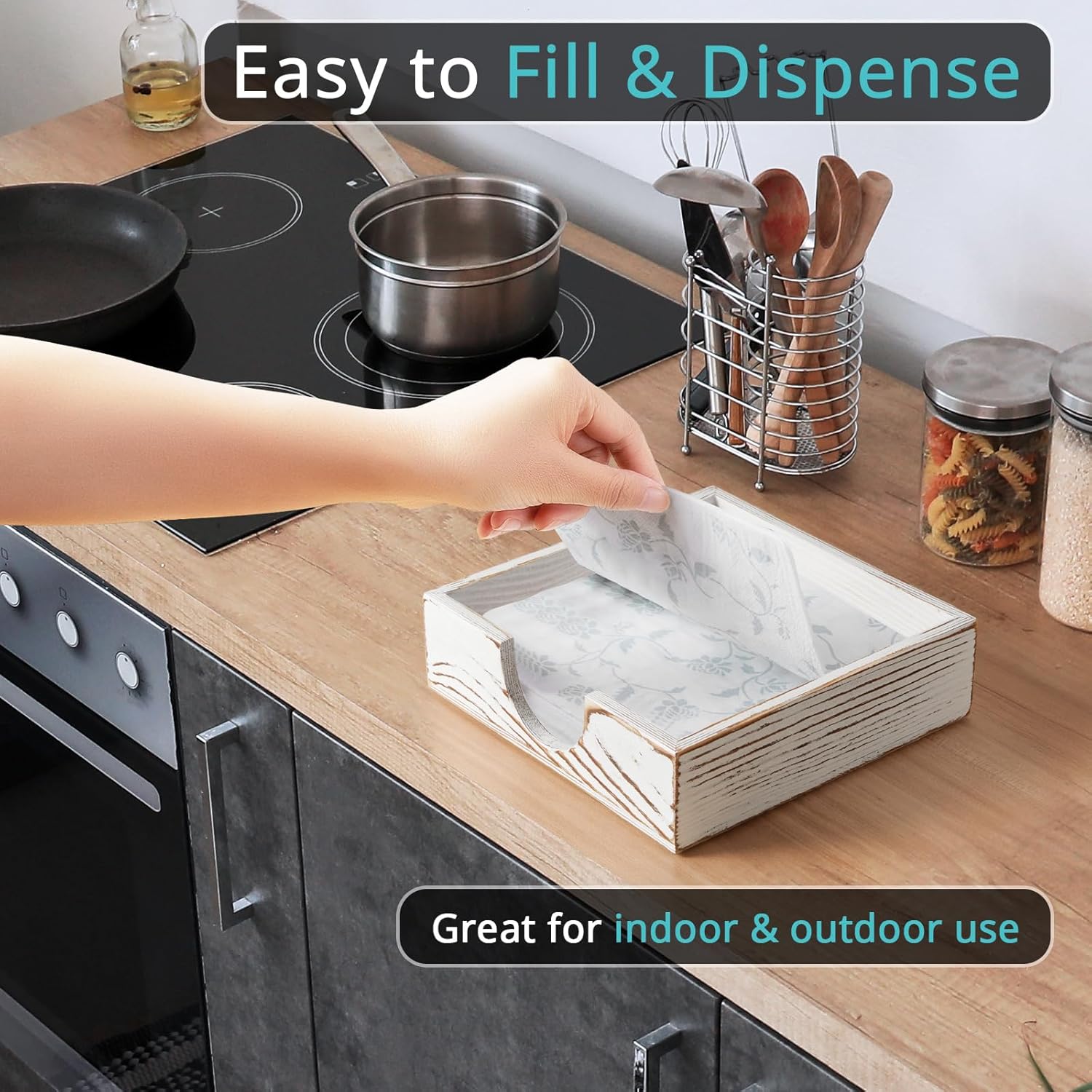 Napkin Holder for Table, White Washed Wood Napkins Holders For Paper Napkins, Flat Napkin Holder for Luncheon, Napkin Holders for Kitchen Dinner Decor, Napkin Dispenser for Indoor & Outdoor Use