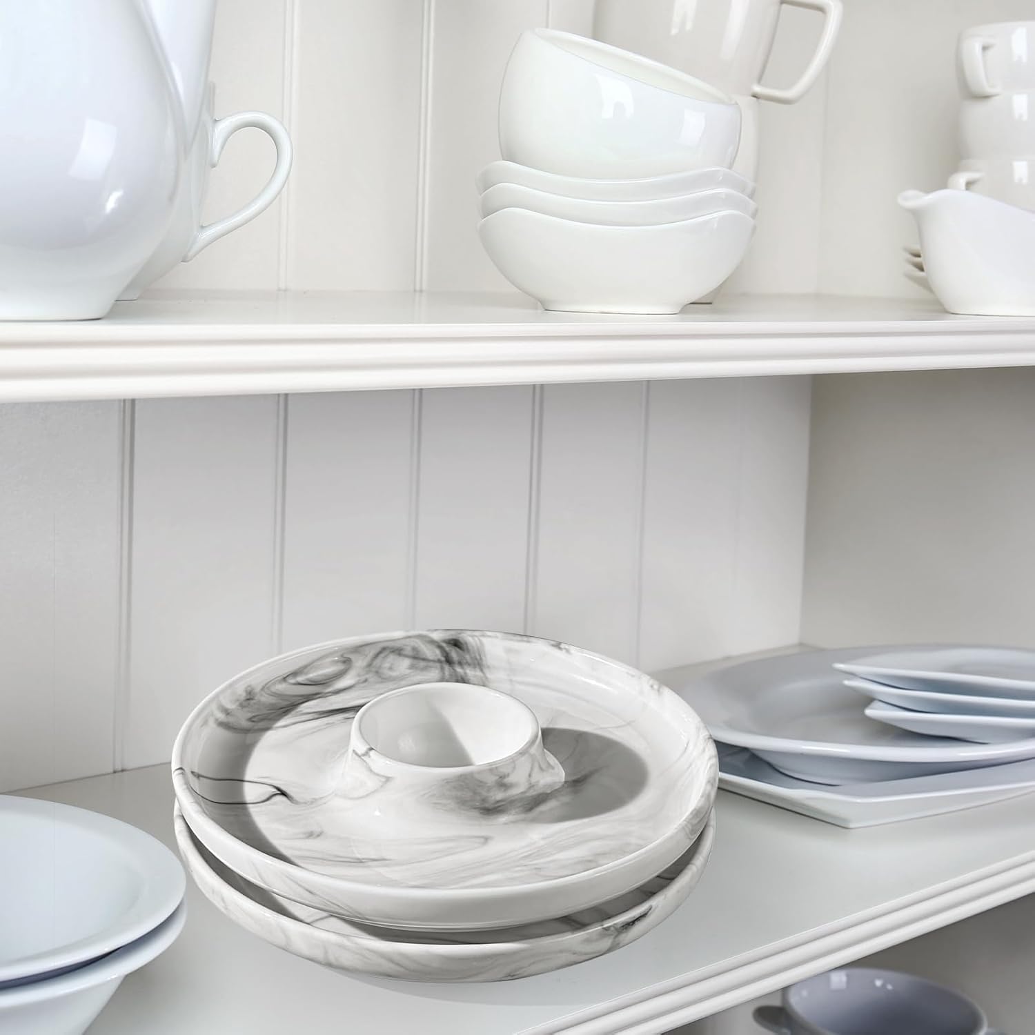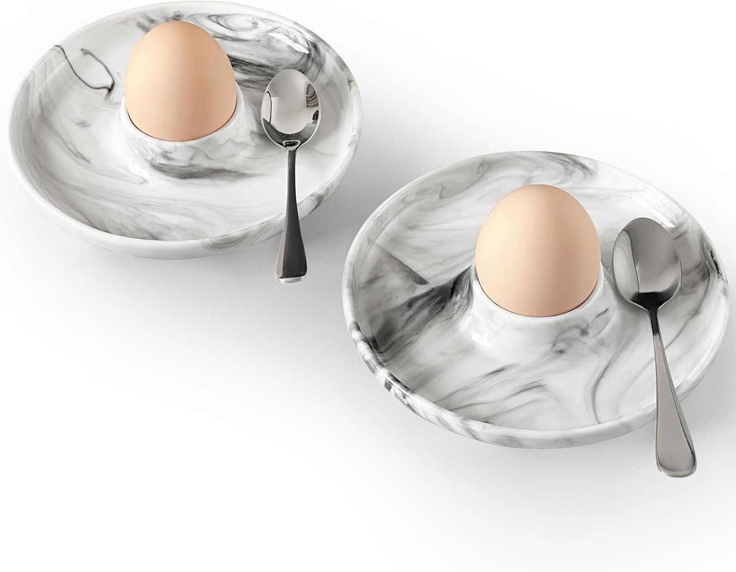 Cinf EggHolder & Spoon Set 2 Ceramic Egg Holders + 2 SS Spoons Breakfast Plate Marble 5.5'' Food Container Egg Tray Dinner Serving for Hard Boiled Eggs, Easter & Deserts Dish