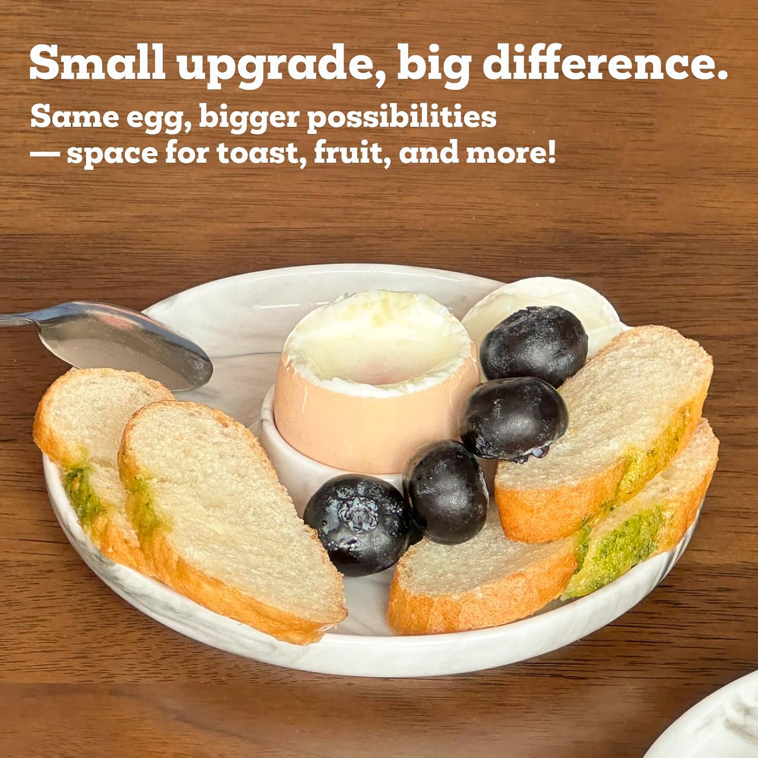 - More than a regular sized ceramic egg holder, this breakfast serving tray, in addition to the center for eggs,diameter 5.5 inches, has a wider area around it to serve breakfast.With the cute egg shape this dish makes a fantastic centerpiece for your table.Comes with a corresponding number of stainless steel spoons for dining.
