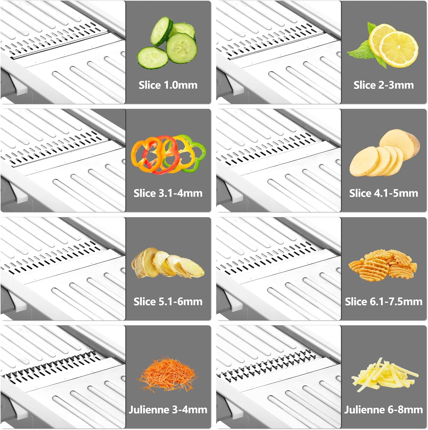 - Adjustable Mandoline Slicer: This slicer comes with a knob to adjust the thickness and julienne size, and removable double-sided blade. It has more than 20 uses for a wide range of ingredients for salads, french fries and dishes