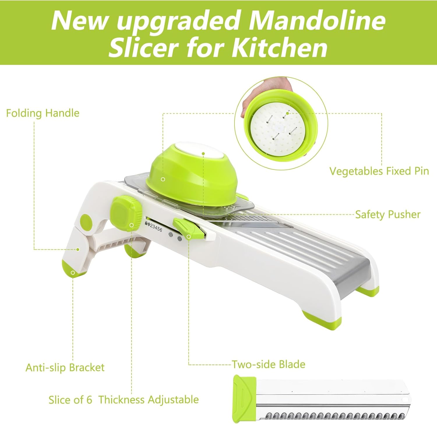 Mandoline Slicer for Kitchen, Adjustable Stainless Steel Mandoline Food Slicer, Onion Potato Cucumber Tomato Carrot Vegetable Fruit Slicer, Mandolin Veggie Cutter with Food Holder, Green