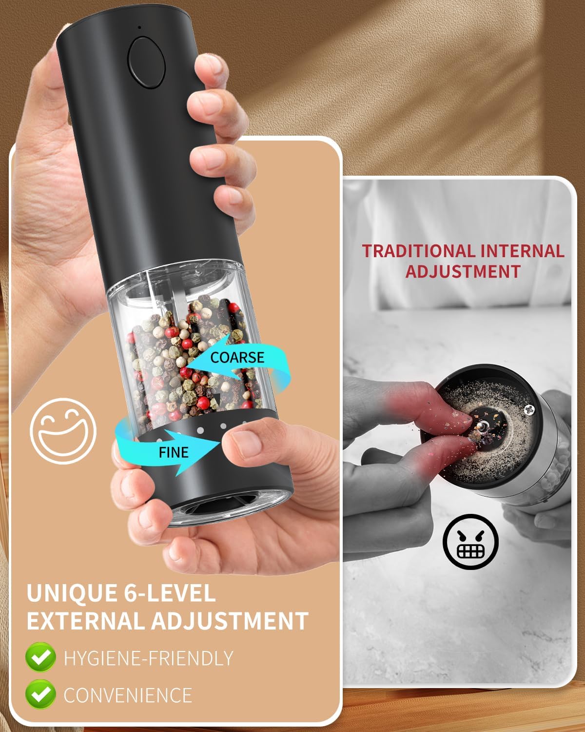 - 【UPGRADED EXTERNAL GRINDING SETTING】This salt and pepper grinder set features an innovative external grinding coarseness adjustment device, which eliminates the need to touch the grinding head and makes it easy to customize the grind even with long fingernails. No need to touch the grinding head, cleaner and more hygienic, perfect for health-conscious chefs