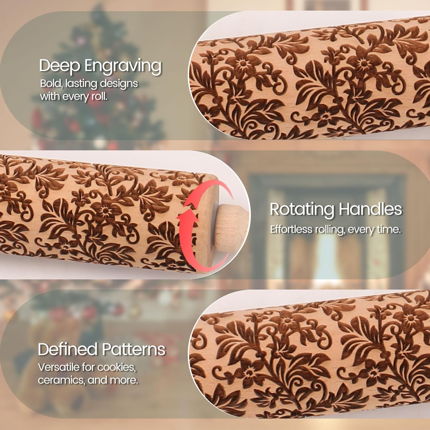 - 🍪 Deep Engraving & Defined Patterns- This wooden embossed rolling pins for cookies features intricate floral vine theme patterns, deeply engraved to a depth of 2-3 mm, creating stunning textured impressions on cookies or clay. It adds an artistic touch to any creation. Whether you're baking for a family celebration or working on a creative DIY project, this cookie rolling pin with designs enhances every endeavor.