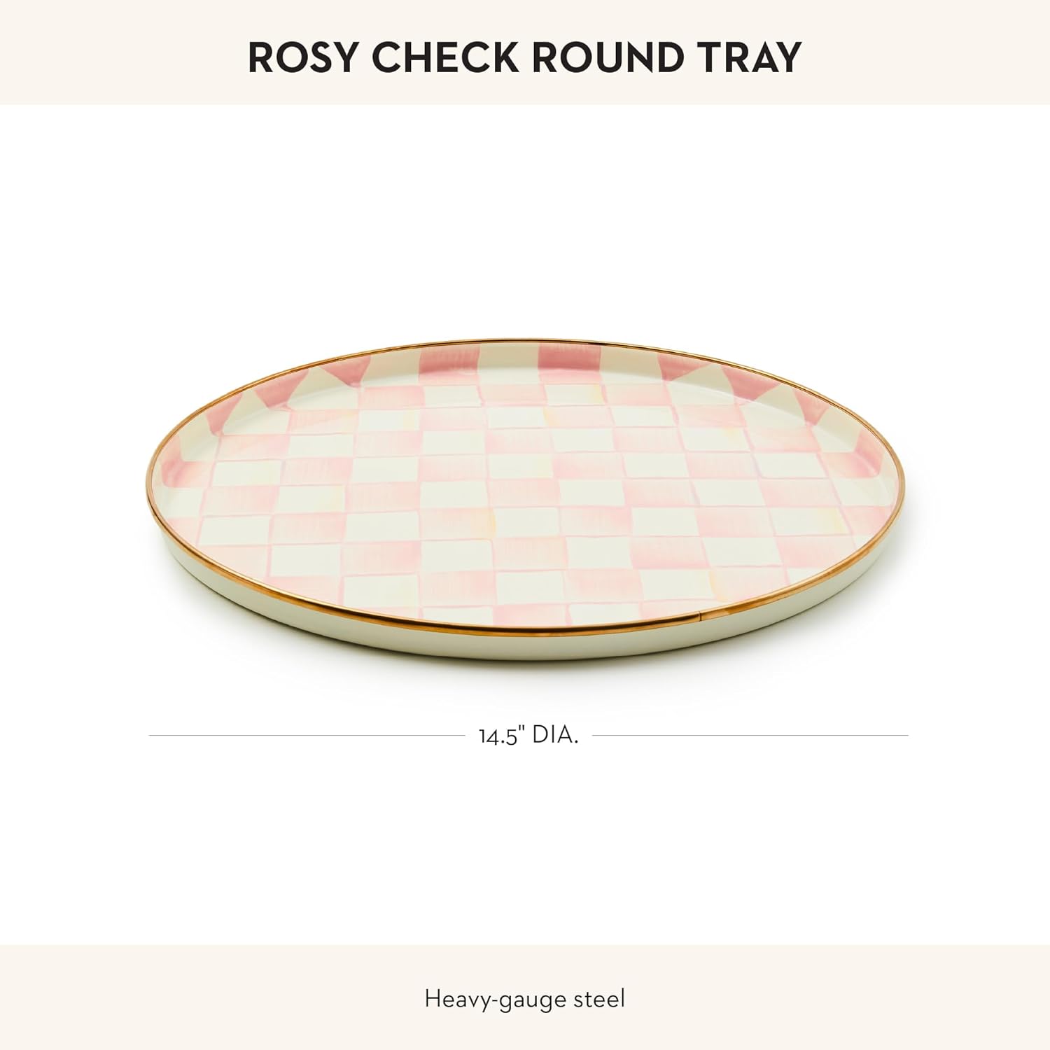 MACKENZIE-CHILDS Enamel Round Tray, Unique Serving Platter for Food and Drinks, Pink-and-White Rosy Check
