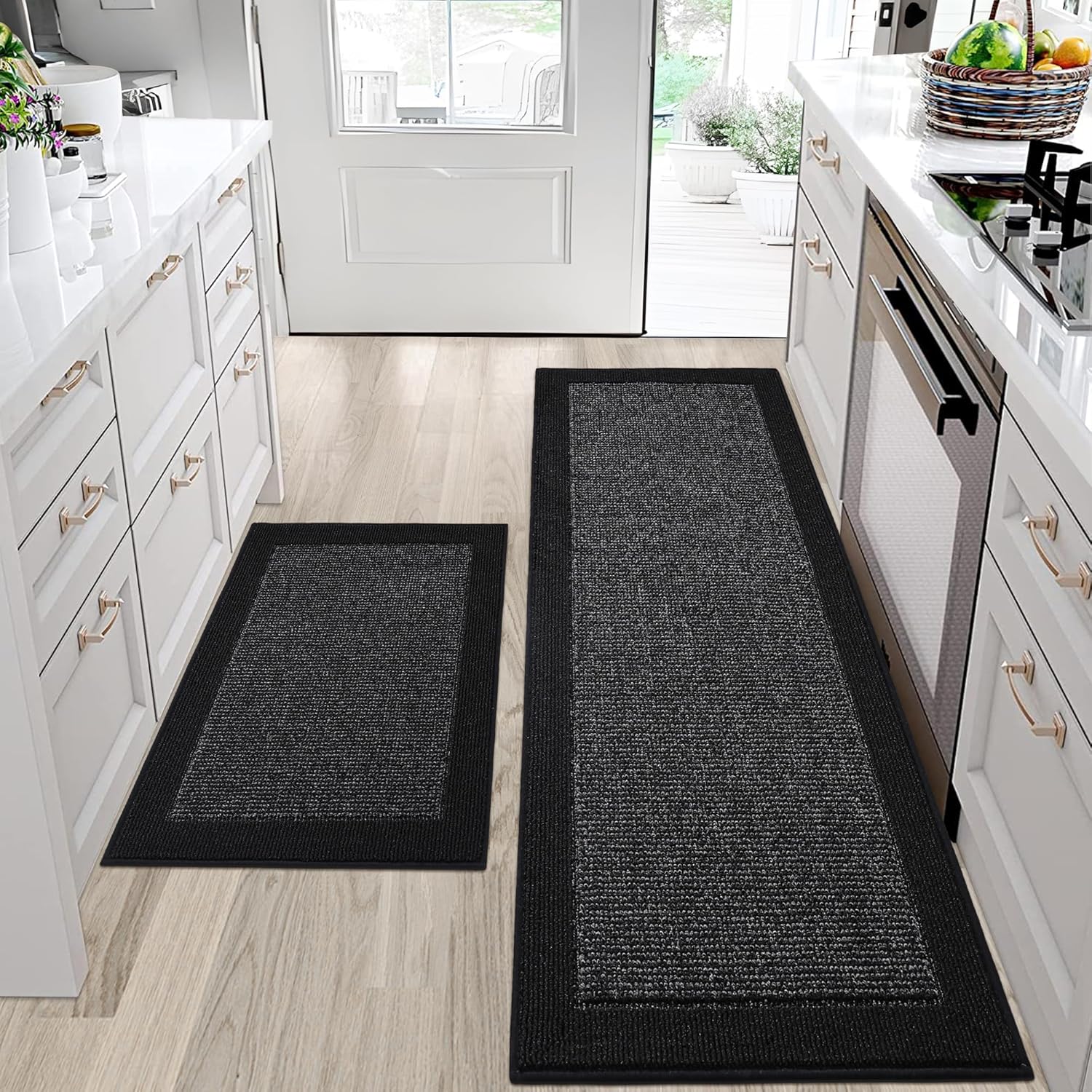 BEQHAUSE Kitchen Rugs and Mats Set of 2 Non-Slip Kitchen Mats for Floor, Absorbent and Stain Resistant Kitchen Runner, Machine Washable Rugs for Kitchen, Laundry & Sink, 24"x36"+24"x60", Black