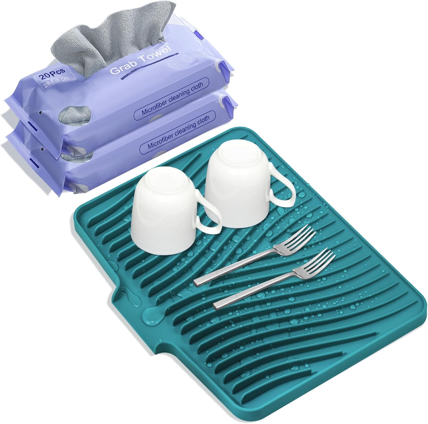 Silicone Dish Drying Mat, Stone Drying Mat for Kitchen Counter with Built-in Drain, Non-Slip 15.8" X 13" Drying Matt Kitchen Counter and Grey Microfiber Cleaning Cloth, Cleaning Rags Set(Green)