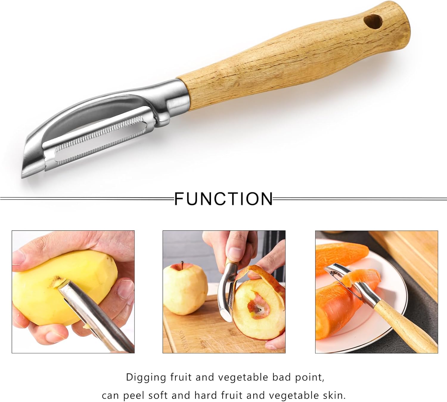 - Peeler Material:This potato peeler is constructed from high quality solid stainless steel and pearwood, sturdy material, beautiful and practical a kitchen peeler.
