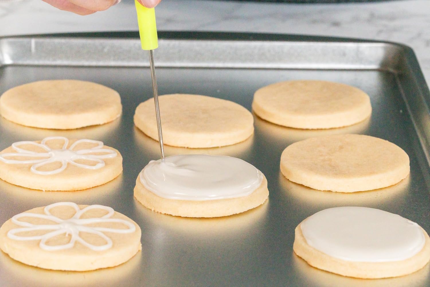 - Royal Icing Tools - This starter set equips you with all the essential tools for cookie decorating, including a spatula, silicone measuring cup, piping bags, couplers, bag clamps, piping tips and scribe tool.