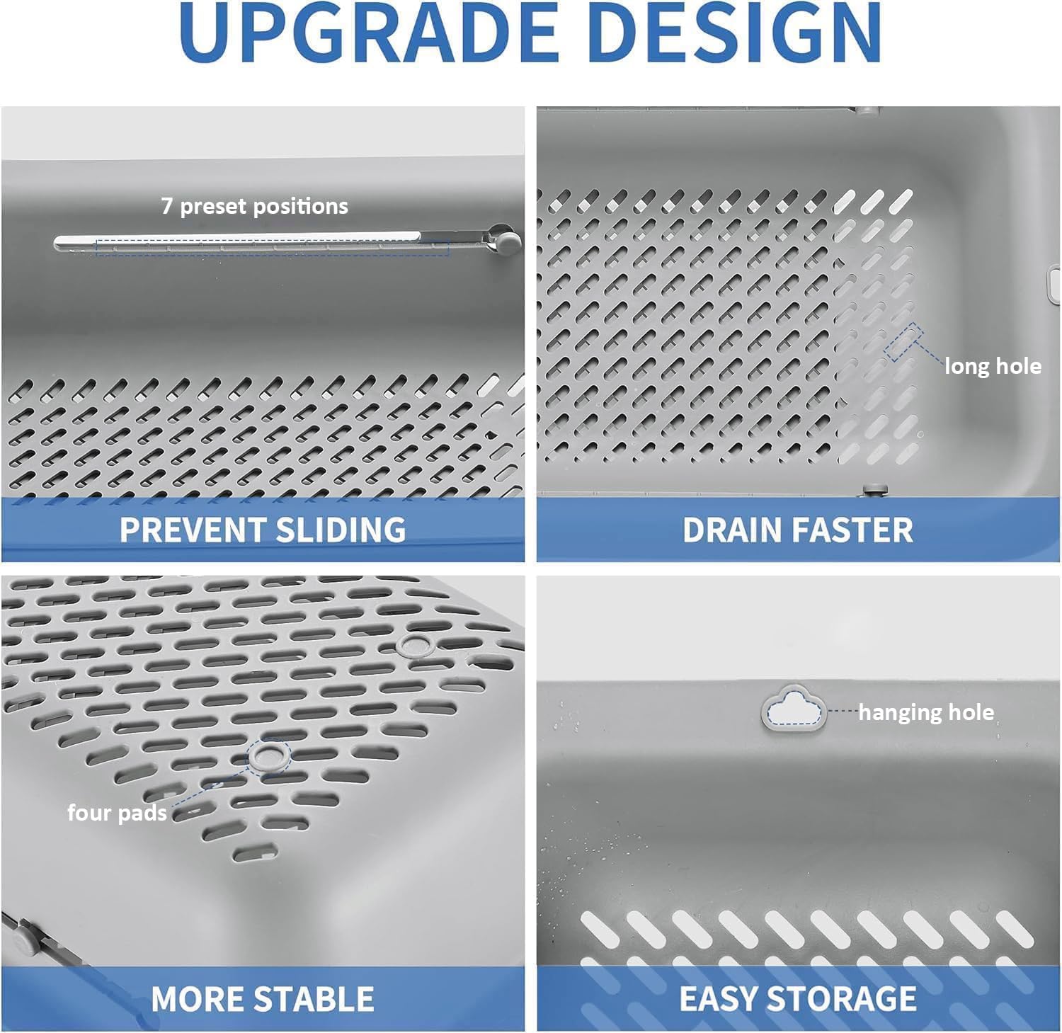 - LASSHSWA upgrade the colander, 7 preset positions - PREVENT SLIDING, long hole - DRAIN FASTER, four pads - MORE STABLE, hanging hole - EASY STORAGE.
