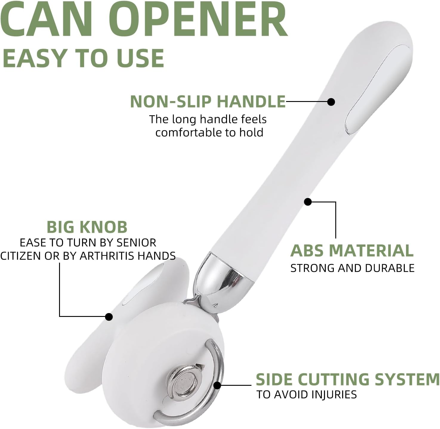 Can Opener Manual Tin Opener Stainless Steel Heavy Duty, Oversized Hand-held Easy Rotary Knob, Safe Cut Manual Can Opener with Non-Slip Handle, Smoother Cut Sharp Blade for Seniors Kitchen Tool, White