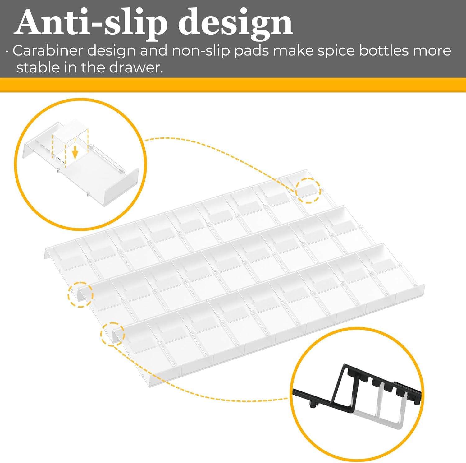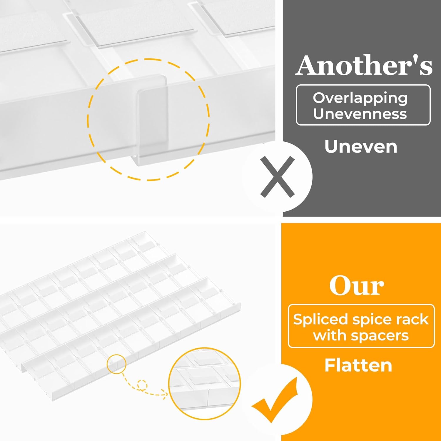 - Customizable Layout: The interlocking design allows you to customize the horizontal arrangement of the spice inserts, helping you make the most of your drawer space. Easily adjust the number of inserts to fit your specific needs and preferences.