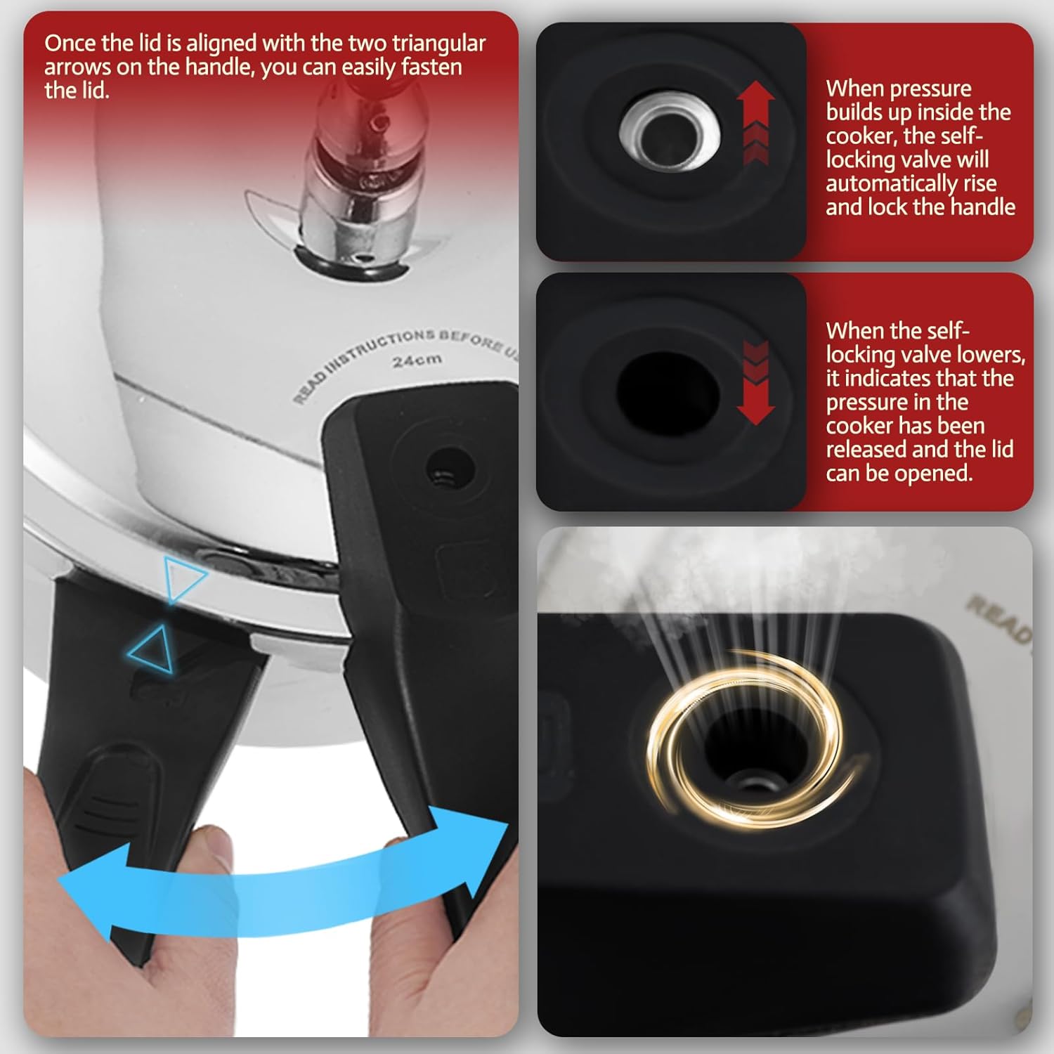 - ✅[Advanced safety design]-Deeluban induction pressure cookers feature innovative automatic pressure-limiting valves, self-locking valves, safety valves and safety windows. The automatic pressure-limiting valve keeps the pressure at optimal levels during cooking; When sufficient pressure builds inside the cooker, the central rod of the self-locking valve rises, and once the pressure is released, the rod lowers, allowing the lid to be opened; If the internal pressure exceeds the safety limit, the safety window automatically releases the pressure.