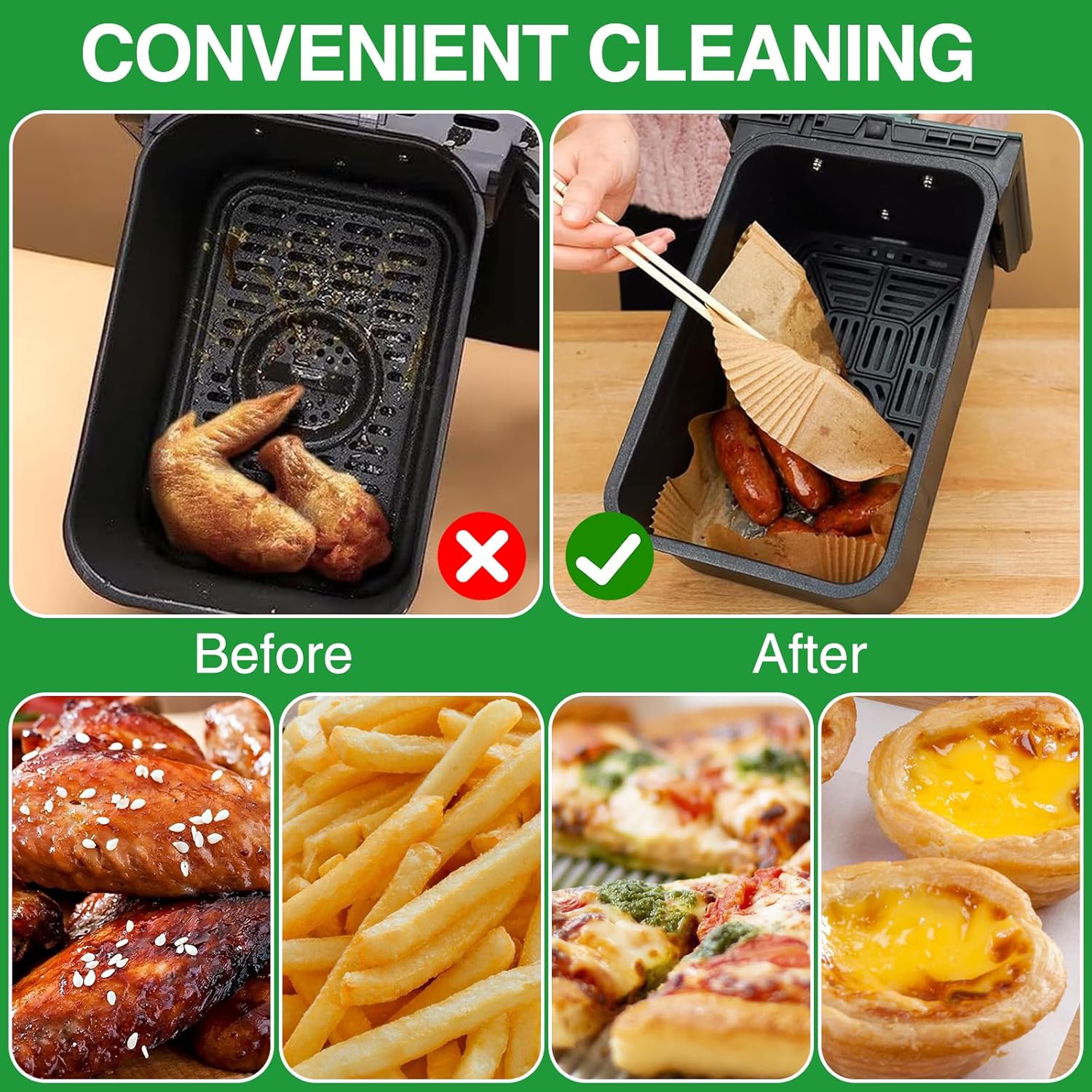 - GREASE AND WATERPROOF: Our air fryer liners are designed to prevent tearing or burning during baking, for an enhanced and flavorful cooking experience. They avoid the grease and food crumbs left in the bottom of the container, saving you the hassle of cleaning.