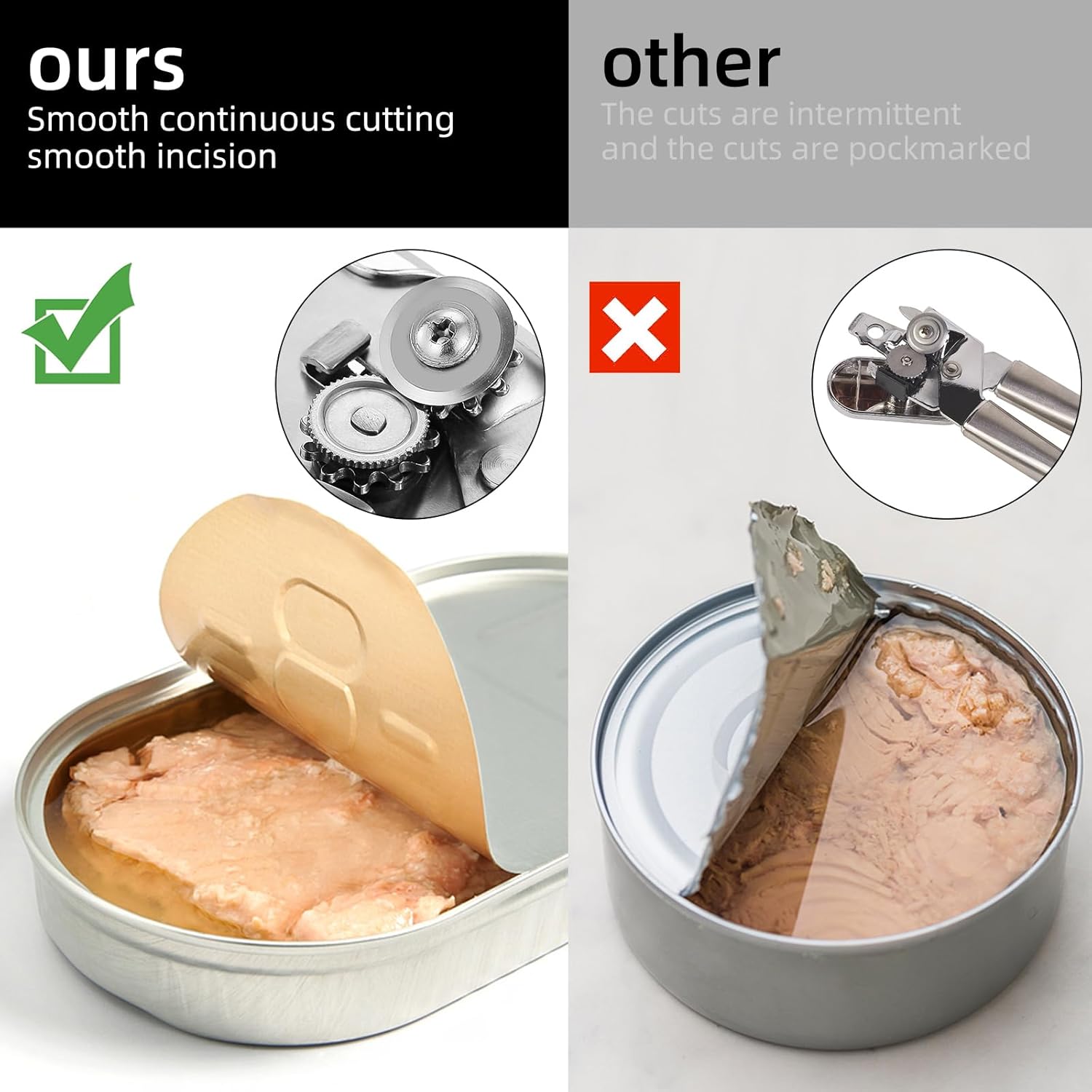 - Sturdy Construction: Built with durable materials, this can opener is made to last through countless uses. Food safety High strength high hardness alloy high carbon stainless steel cutting blades stay sharp, suitable for opening cans of all sizes and can be safely in direct contact with food. After use, it can be cleaned in the sink or dishwasher, stainless steel tableware will never rust, and it will be a reliable tool in your kitchen for years to come