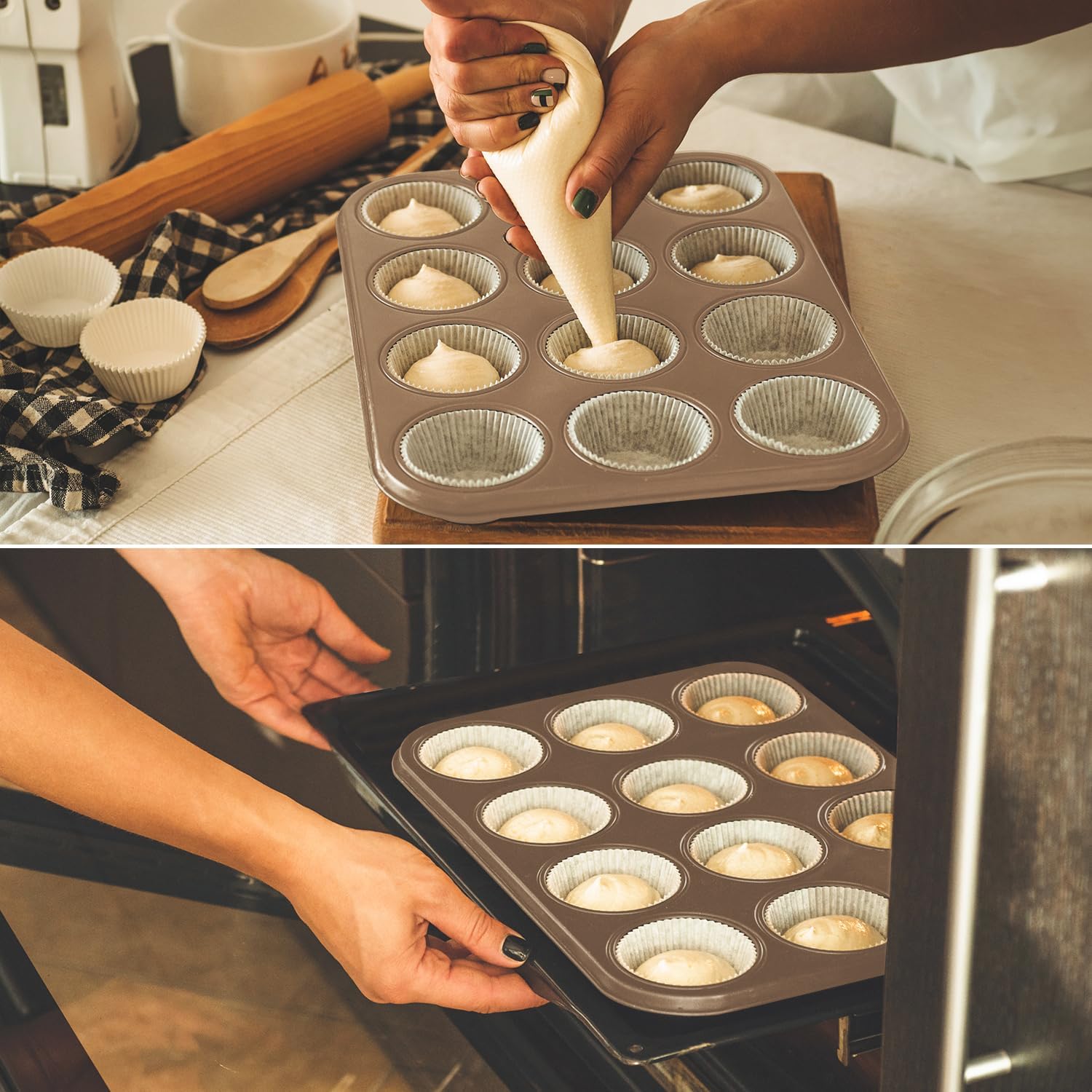- PREMIUM 2-PACK MUFFIN PANS - Complete set includes two 12-cup nonstick pans (13.6"x10.3") with 2.9" diameter cavities - perfect for standard cupcakes and muffins. Extra-thick carbon steel ensures professional results.