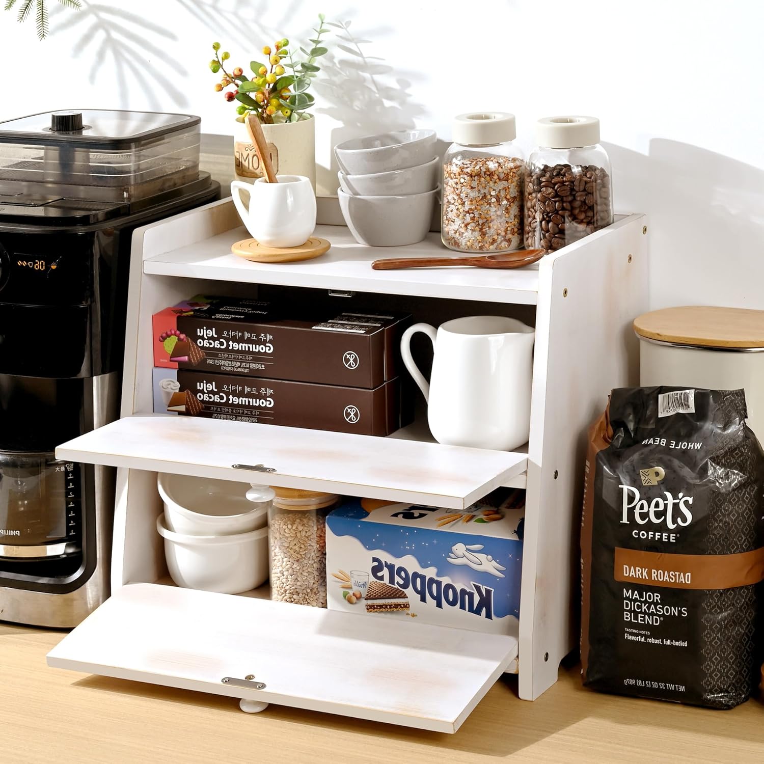 - Large Capacity: The two layers pantry organizers and storage measures 15.7*9.8*12.6 inches, the unique double bamboo panel divider design of the pantry organizer provides two separate bread storage spaces, each with its own doors, ensuring that the bread flavors never clash. you can store different flavors of bread separately in the bread holder for kitchen counter, such as long bread, loaves of bread, sandwiches, hamburgers, rolls, muffins, Hawaiian bread, bagels, crepes, etc.