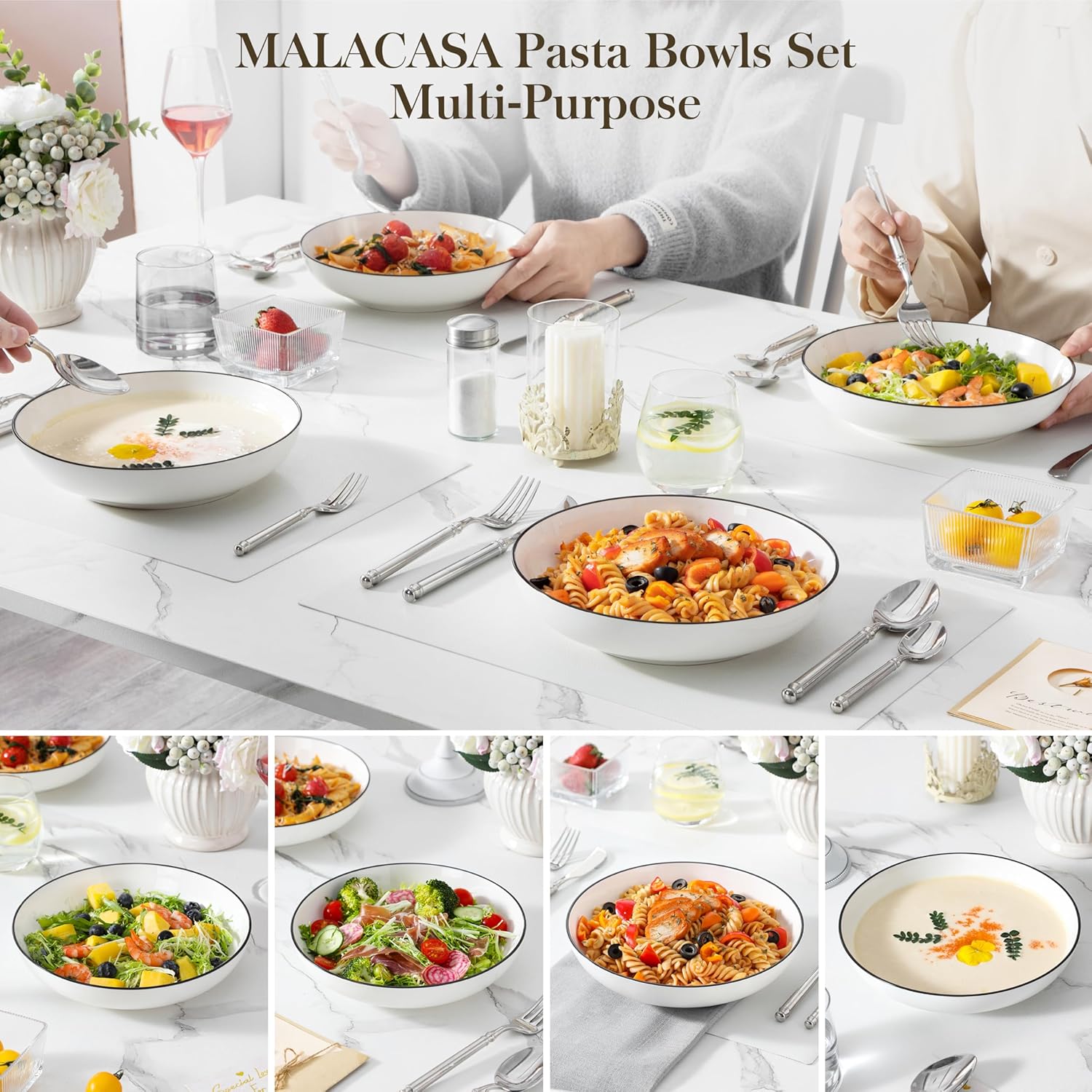 - 【WIDE & SHALLOW DESIGN】White Pasta Bowls featuring a wide and shallow design prevents spills and messes. Featuring a modern and minimalist design with a classic white finish and smooth glaze, these bowls complement any table setting and enhance dining experience.