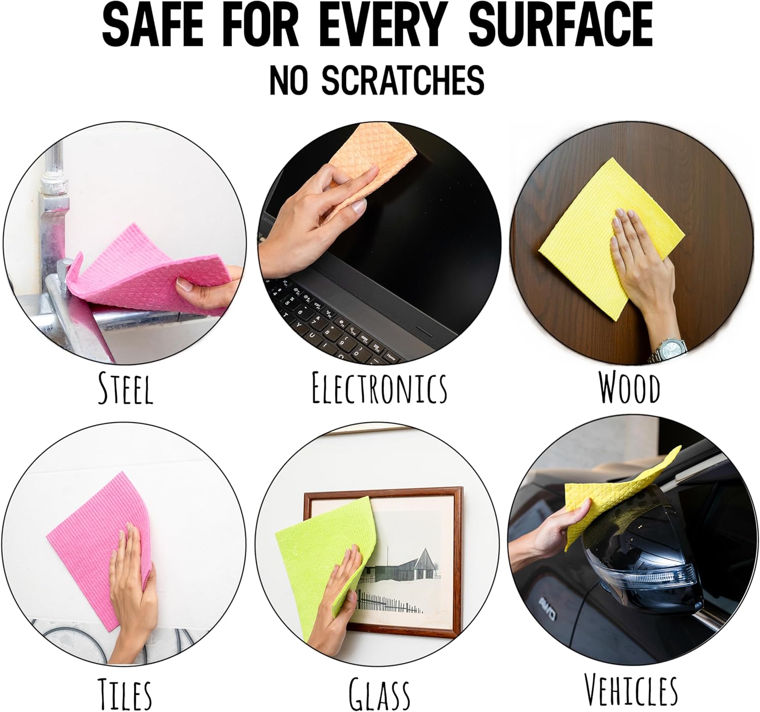 - VERSATILITY: Our disposable dish cloths for washing dishes are perfect for various cleaning tasks like scrubbing dishes, wiping countertops, or cleaning glass surfaces, these Swedish dish towels for kitchen provide a streak-free shine. Use our kitchen cloths for dishes for an effective clean. These reusable cloth paper towels are also safe for marble, stainless steel, and wood. These sponge cloth kitchen reusable work perfectly for all purposes. Use our dish wash cloths for a sparkling clean.