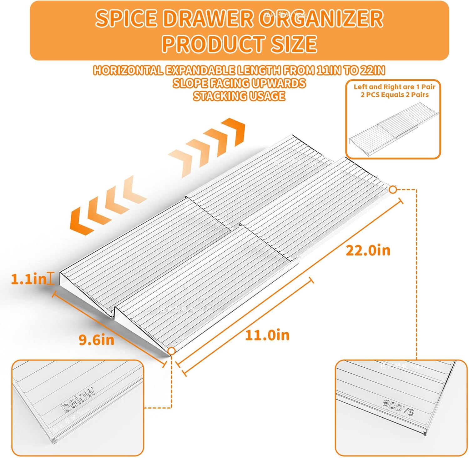 - 【Fits Most Kitchen Drawers,Cabinets】our in drawer spice organizer with layered design to be expandable from 11" to 22", this seasoning drawer organizer measures 11"L x 4.7" W x 1.1"H per piece(Suggest measuring whether the drawer meets the minimum size)