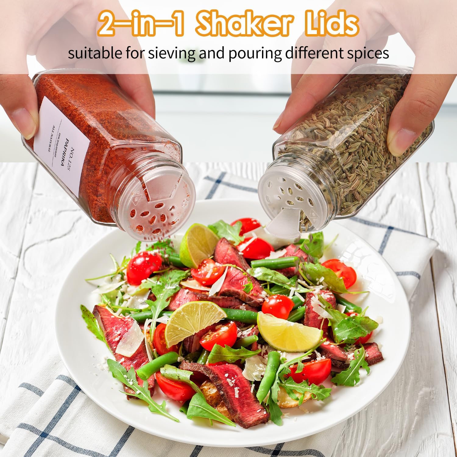- 2 - 1 Shaker Lid: Empty spice bottles come with a two-in-one shaker lid that is open on one side and perforated on the other, eliminating the need to change lids when using powdered spices or herbs. Increases the convenience of mixing spices while cooking