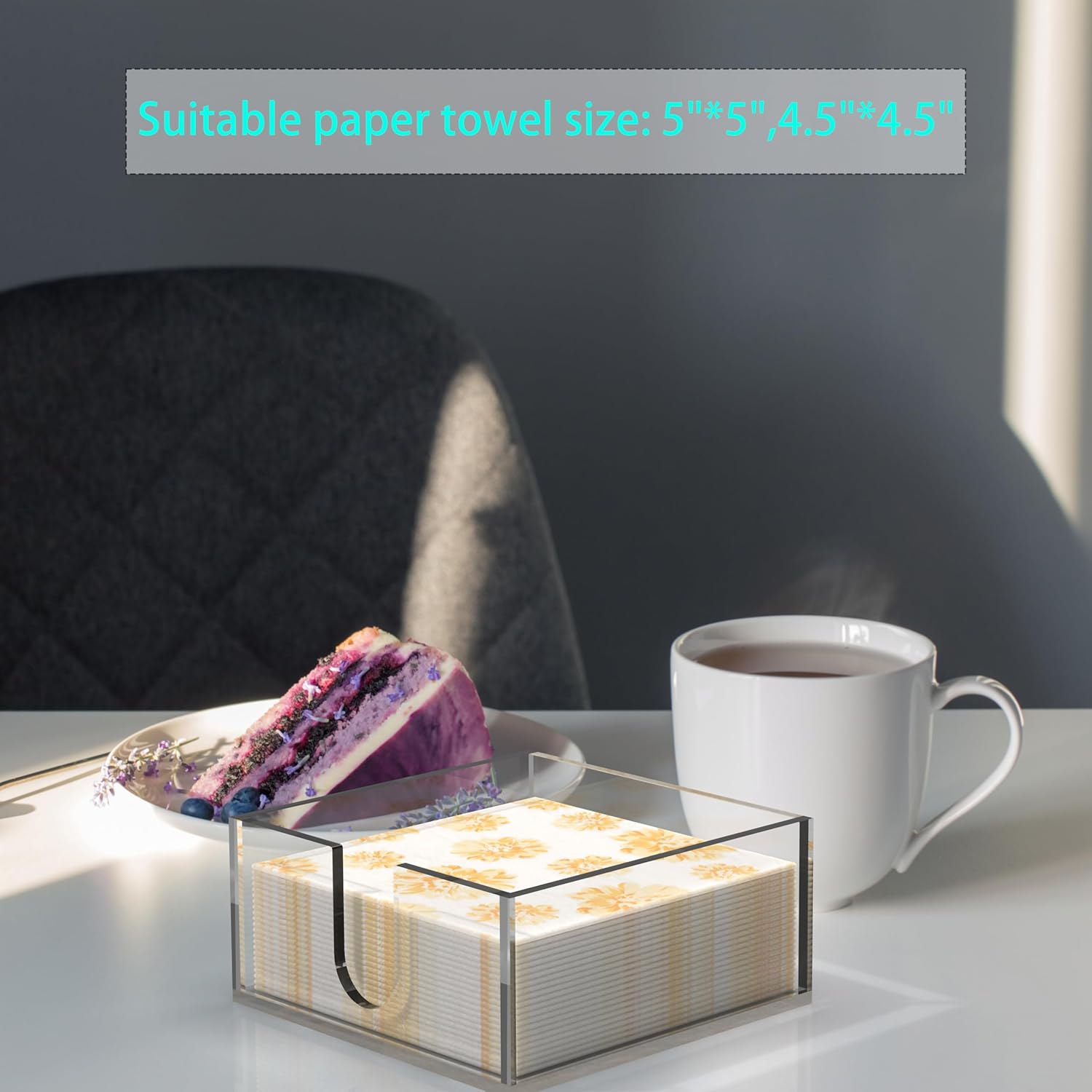 - Applicable size: The square napkin holder measures 5.3 x 5.3 x 2.4 inches, suitable for standard sized lunch napkins/dinner napkins or cocktail napkins/coasters/memos, etc.
