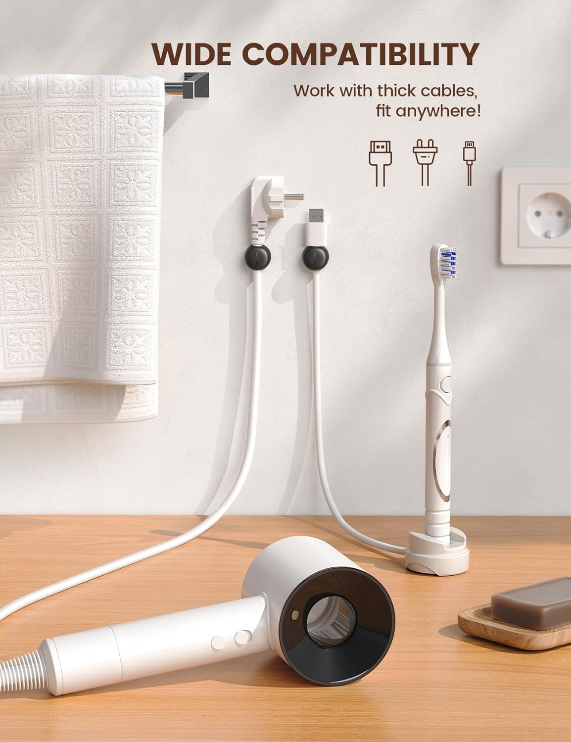 - [8mm Wider Cable Slot Diameter] With a slot diameter ranging from 2.5mm to 8mm (0.1"-0.32"), our cable management organizer clips can tackle a wide variety of wires, including Type-C charger, Lightning cords, HDMI cables, USB, computer power wires, network cords, headphone cords, keyboard cables, TV cables and more. These cable organizers are the perfect desk accessory to keep your office or home workspace neat and organized