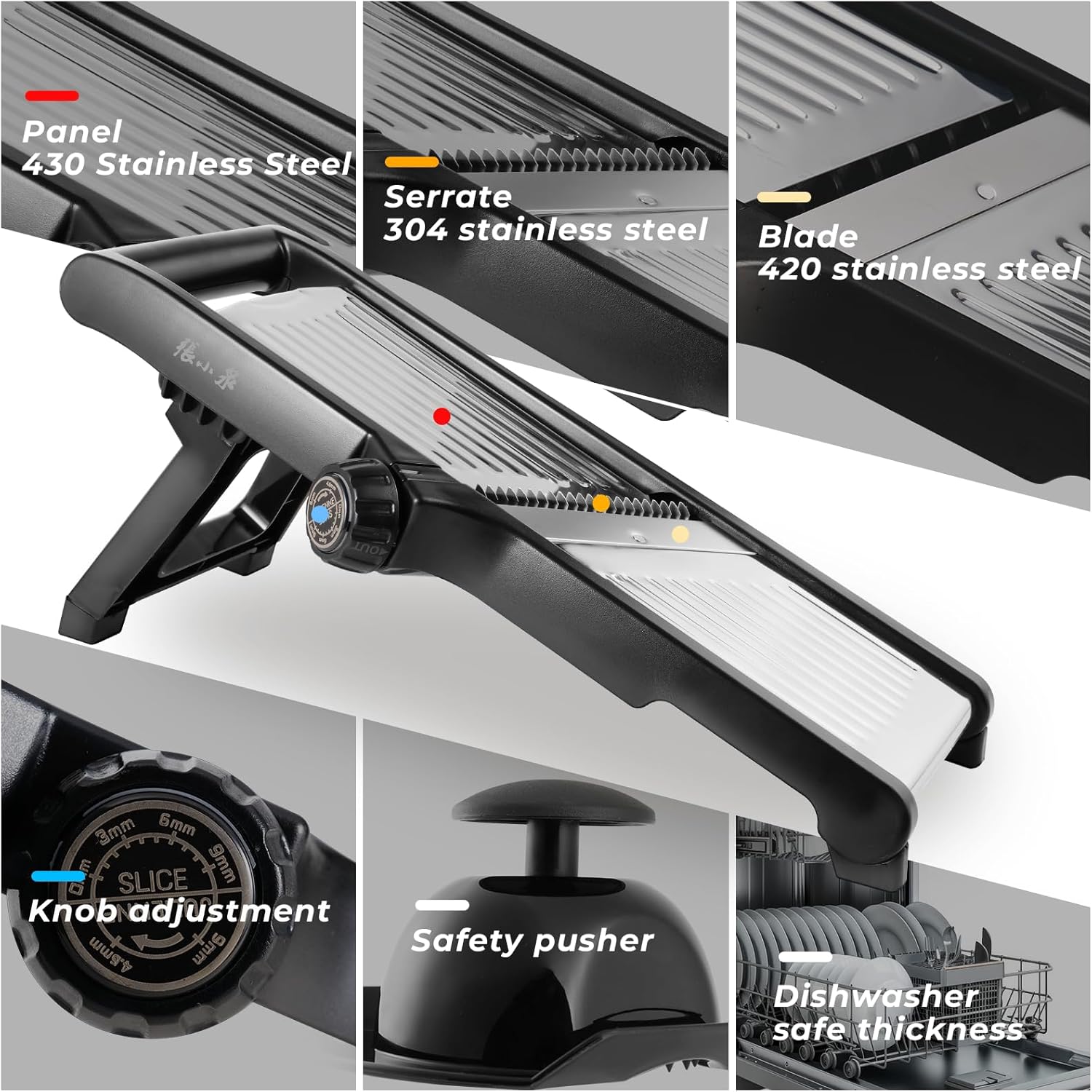 - Adjustable Mandoline Slicer: We designed three kinds of thickness slicing blades-3mm, 6mm and 9mm; two julienne settings-4.5mm and 9mm. With built-in rotating adjustable blade, if need to adjust thickness or change cutting options, just adjust knob, no need to touch the blade.