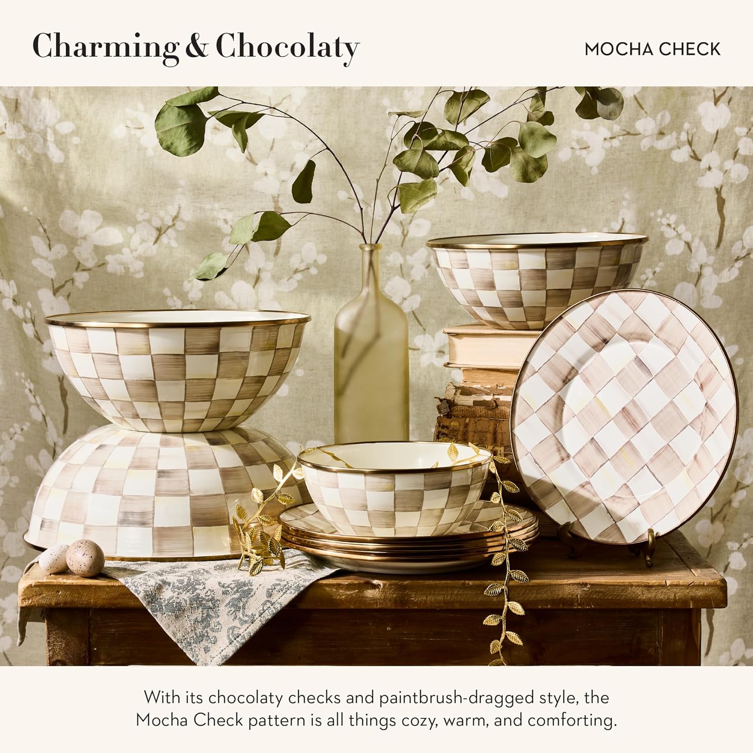 - ENTERTAINING ESSENTIAL: Elevate any meal with this decorative bowl’s Mocha Check pattern, featuring glossy, high-contrast hand-painted brown-and-white checks. It has a hand-glazed heavy-gauge steel underbody and a bronzed stainless-steel rim.
