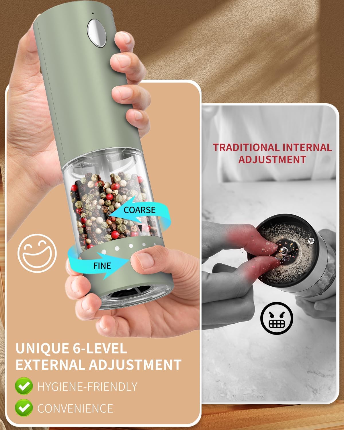 - ✔️ADJUSTABLE COARSENESS - This automatic salt and pepper grinder can meet your grinding needs. Easily adjust the core to achieve the perfect coarseness for grinding salt, pepper, or any other seasoning of your choice. The pepper grinder set is made of a high-quality ceramic grinding core to help you retain the original flavor of the spices