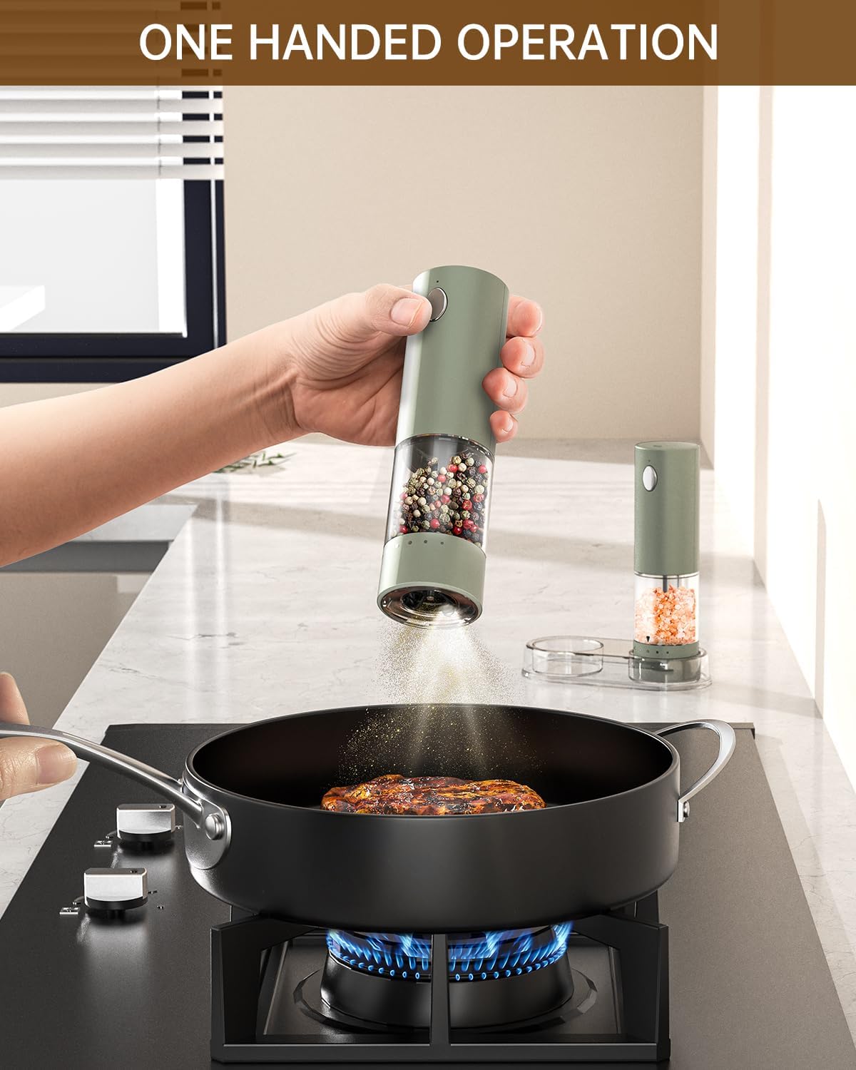- ✔️ONE-HANDED OPERATION - With a simple press of the button, this rechargeable electric pepper grinder set offers effortless and user-friendly operation, allowing you to season your dishes with just one hand. The electric salt and pepper grinder set includes a transparent storage base to keep your grinders organized and your kitchen countertop tidy