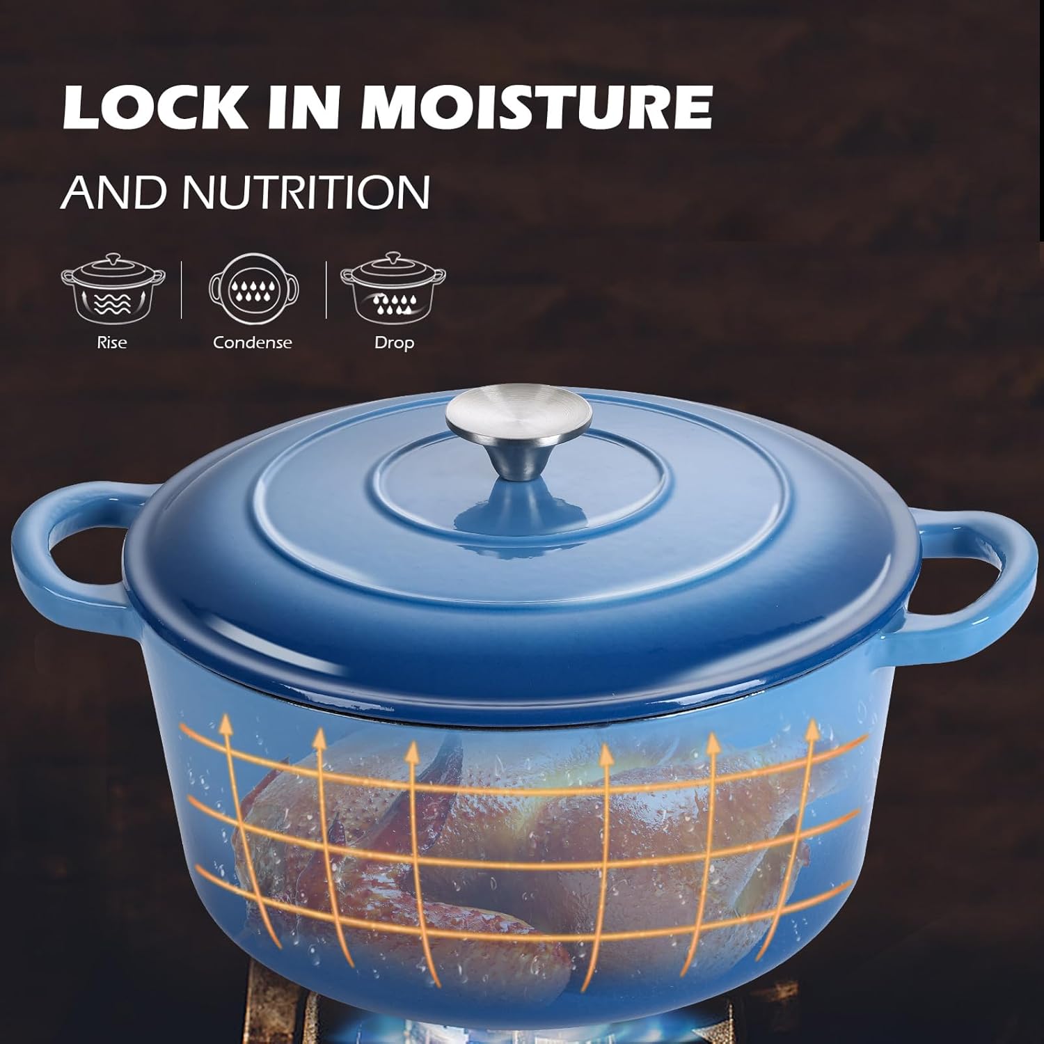 - Moisture-Rich Cooking, this enameled cast iron Dutch oven is design with circulating shower type lid, the raised design of the pot cover allows the water vapor circulates and locks inside the Dutch oven, fully releasing the flavor and nutrients of the ingredients, possess pretty heat retention performance