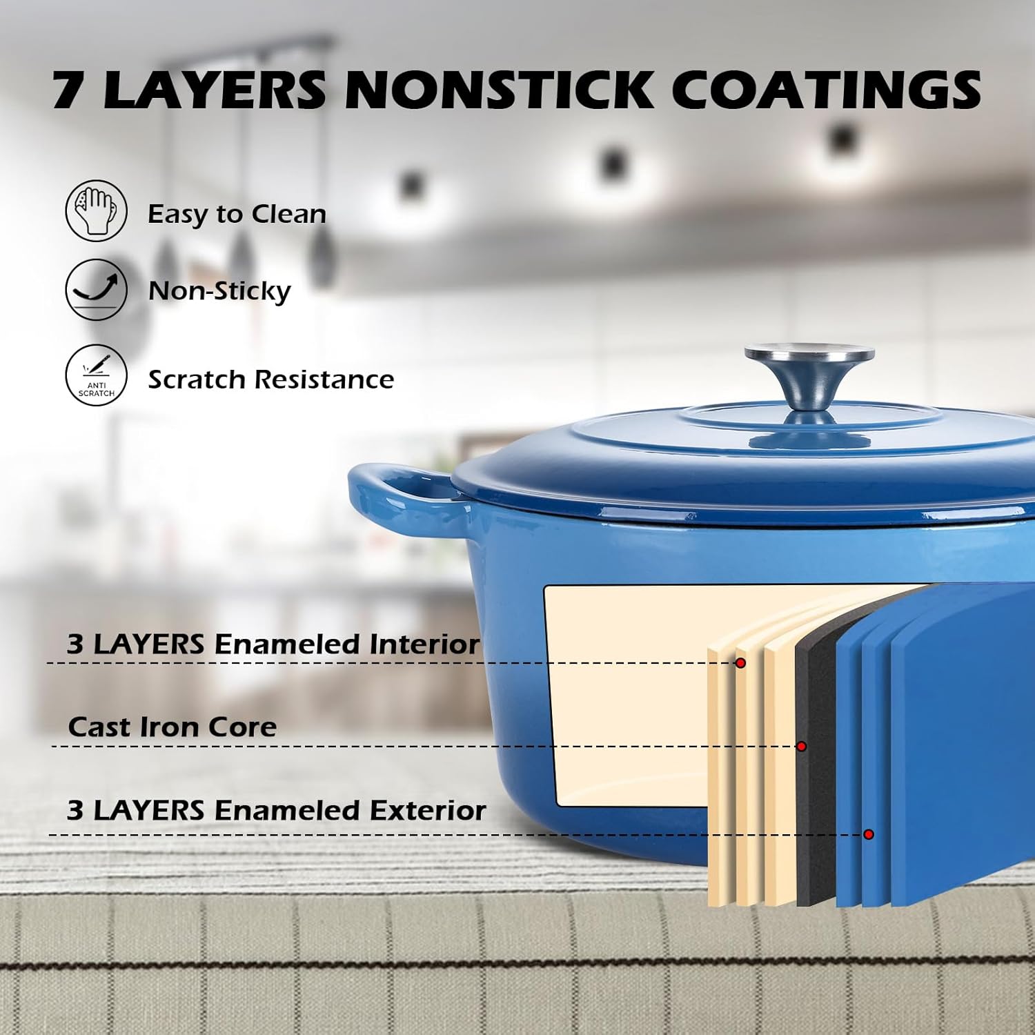 - Heavy Duty Material, Dutch oven pot with lid is made of 6 layers enamel and cast iron core layer, 4mm thickness pot wall with one-piece molding design enhance the strong construction without cracks or chips, high gloss enamel surface with no chemicals, form a layer of smooth coating to keep away from rusting and reduce food sticking
