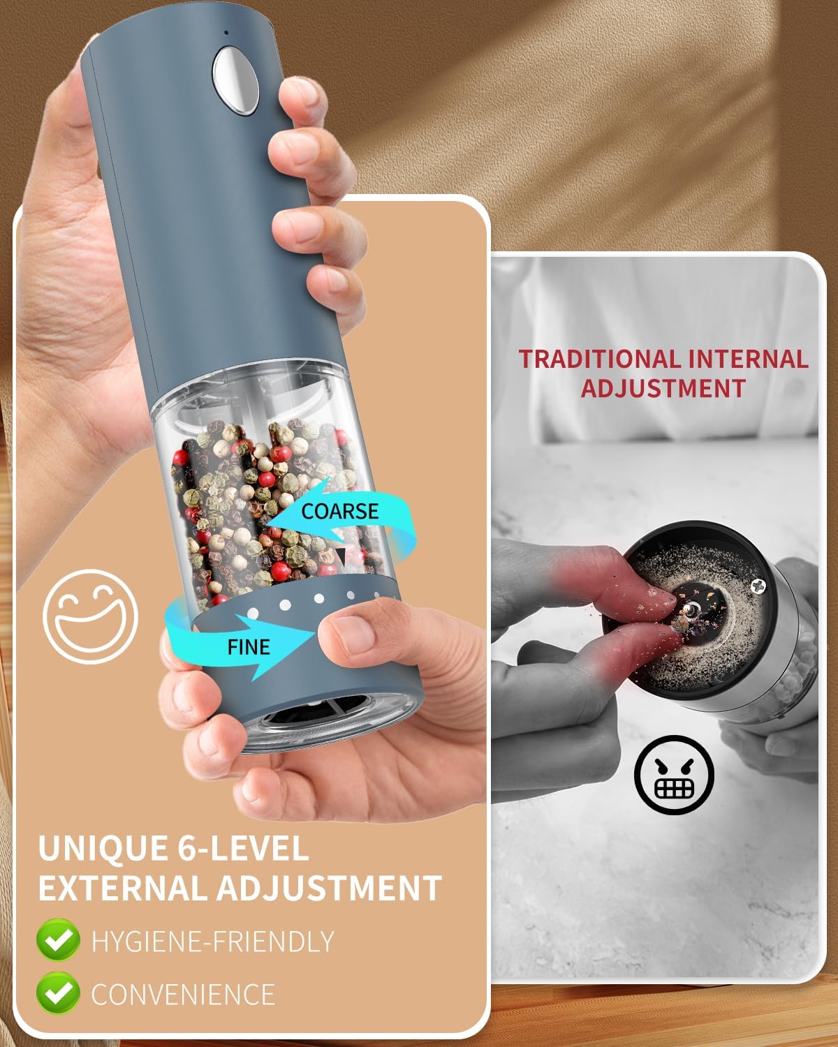 - ✔️ADJUSTABLE COARSENESS - This automatic salt and pepper grinder can meet your grinding needs. Easily adjust the core to achieve the perfect coarseness for grinding salt, pepper, or any other seasoning of your choice. The pepper grinder set is made of a high-quality ceramic grinding core to help you retain the original flavor of the spices