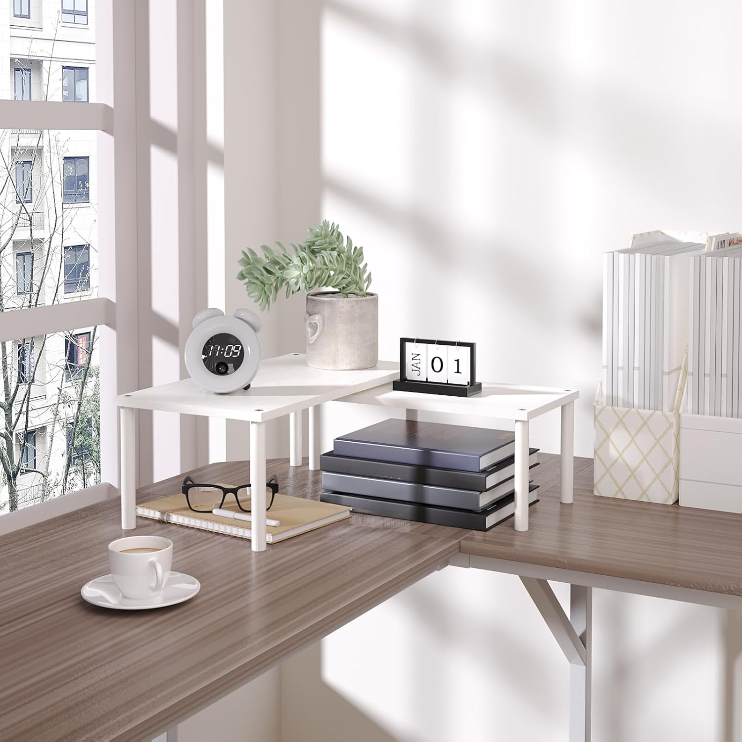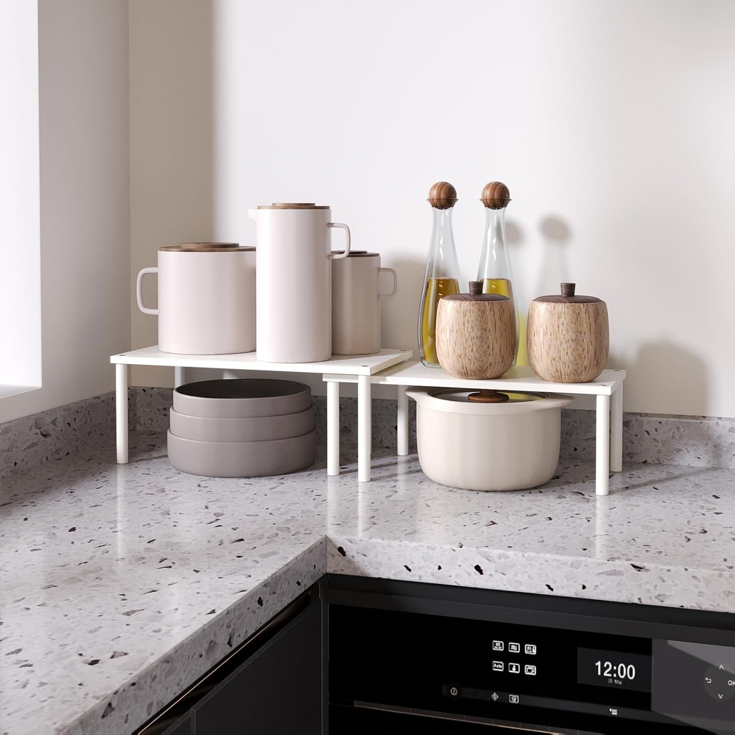 - 【Flexible Combination, Space Optimization】With their unique design, with one slightly smaller than the other, these shelf organizers can be stacked on top of one another, nested, used separately, or even in an L-shape.It is a flexible storage solution that transforms your kitchen into a more organised and tidy space.