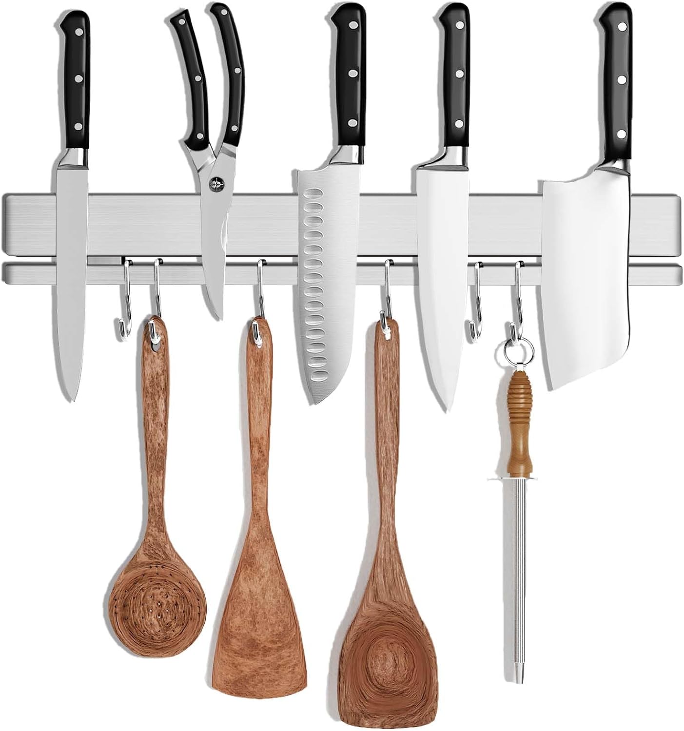 - 【17" Multifunctional Storage with 12 Hooks】Our upgraded 17-inch kitchen knife magnetic holder holds 5-8 knives and includes 12 dedicated stainless steel hooks. This magnetic tool holder strip eliminates clutter by storing knives, tools, and utensils