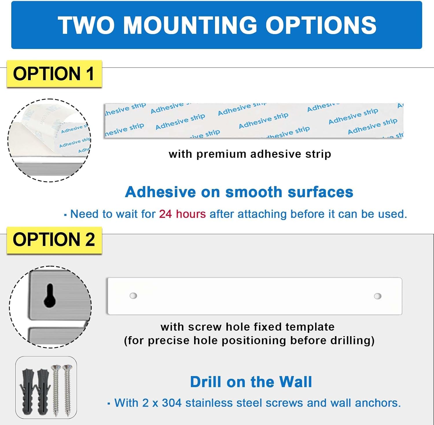 - 【Dual Installation Freedom (Drill or No Drill)】With our magnetic knife holder for wall, you can choose your perfect mount: Effortless premium adhesive installation (wait 24 hours) for smooth surfaces like tile/glass, or permanent screw mounting with included hardware. This versatile magnet knife holder is suitable for any wall types and preference