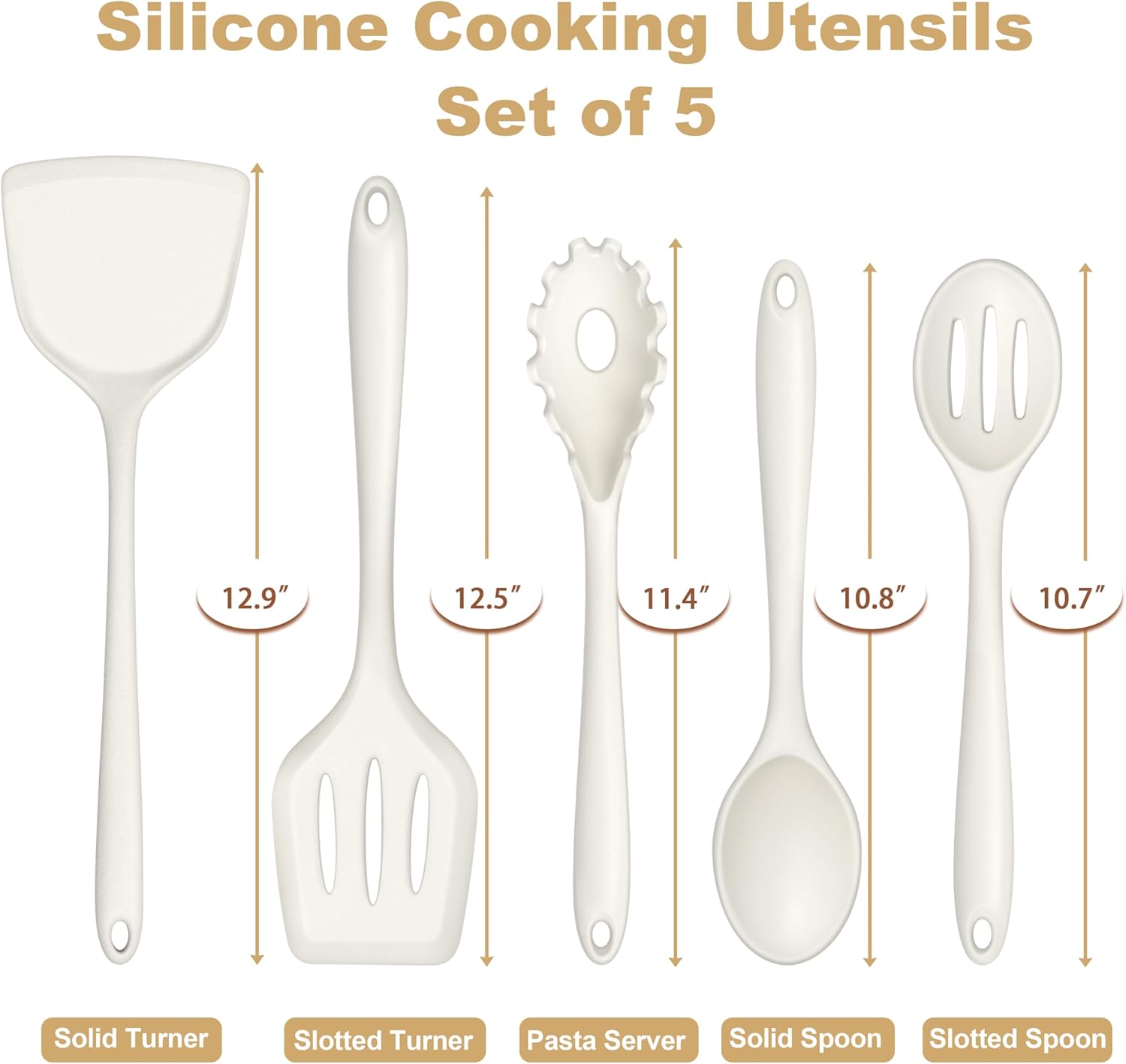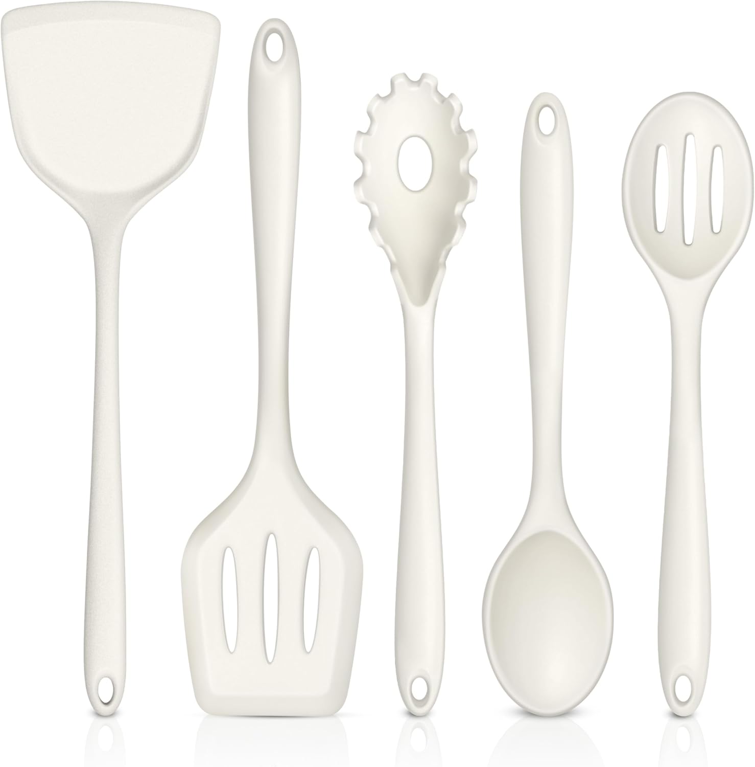 TeamFar Silicone Cooking Utensils Set of 5, Kitchen Utensils Solid & Slotted Spoons Turners Pasta Server for Nonstick Cookware, Healthy & Heat-Resistant, Seamless & Non-Scratch, Dishwasher Safe, White