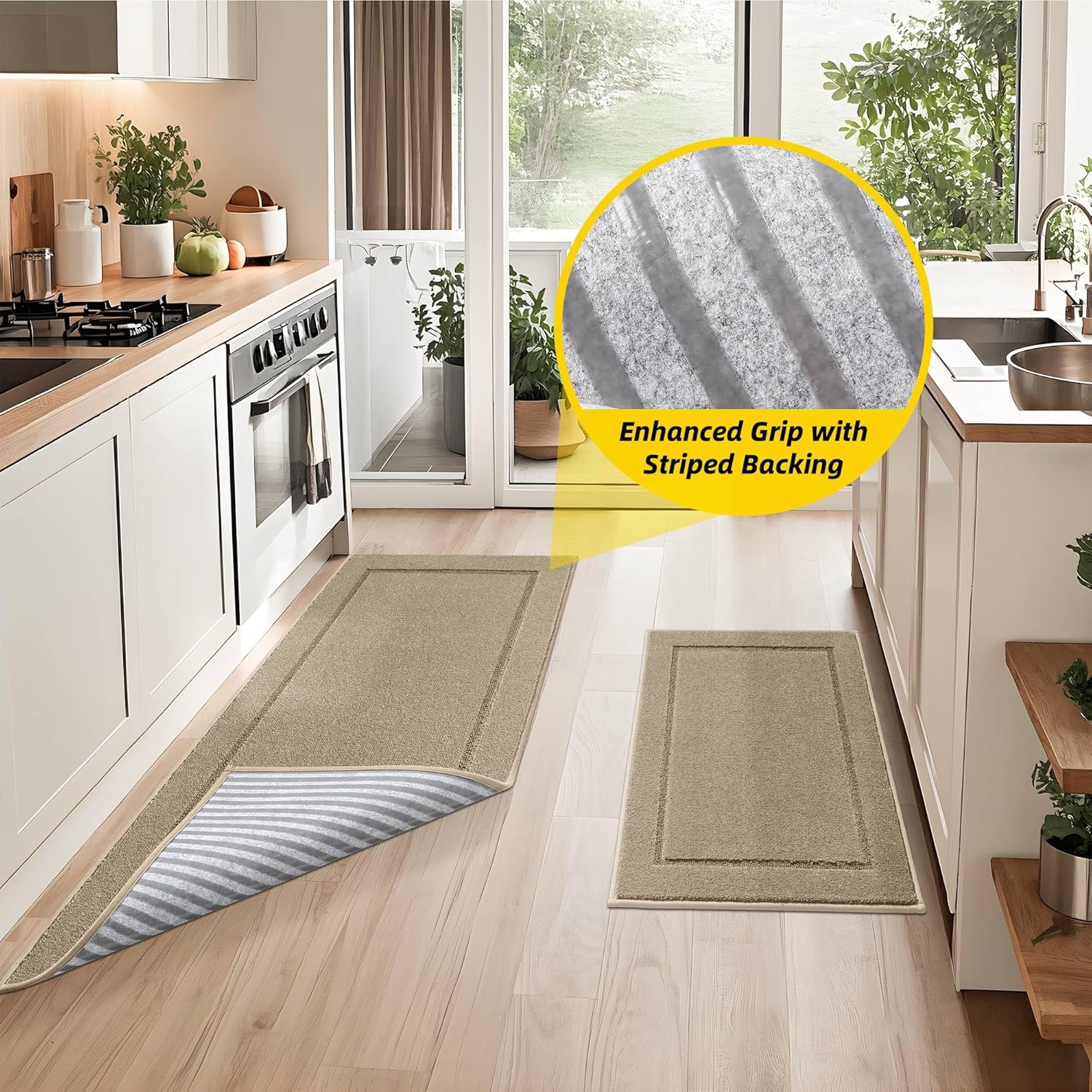 JSEI Non-Slip Kitchen Mats, Self Adhesive No Sliding Kitchen Rugs Set of 2, Washable Absorbent Floor Mat for Kitchen, Bathroom, Laundry Room, Bedroom, 20”x32”+20”x48”, Beige, Rectangular Pattern