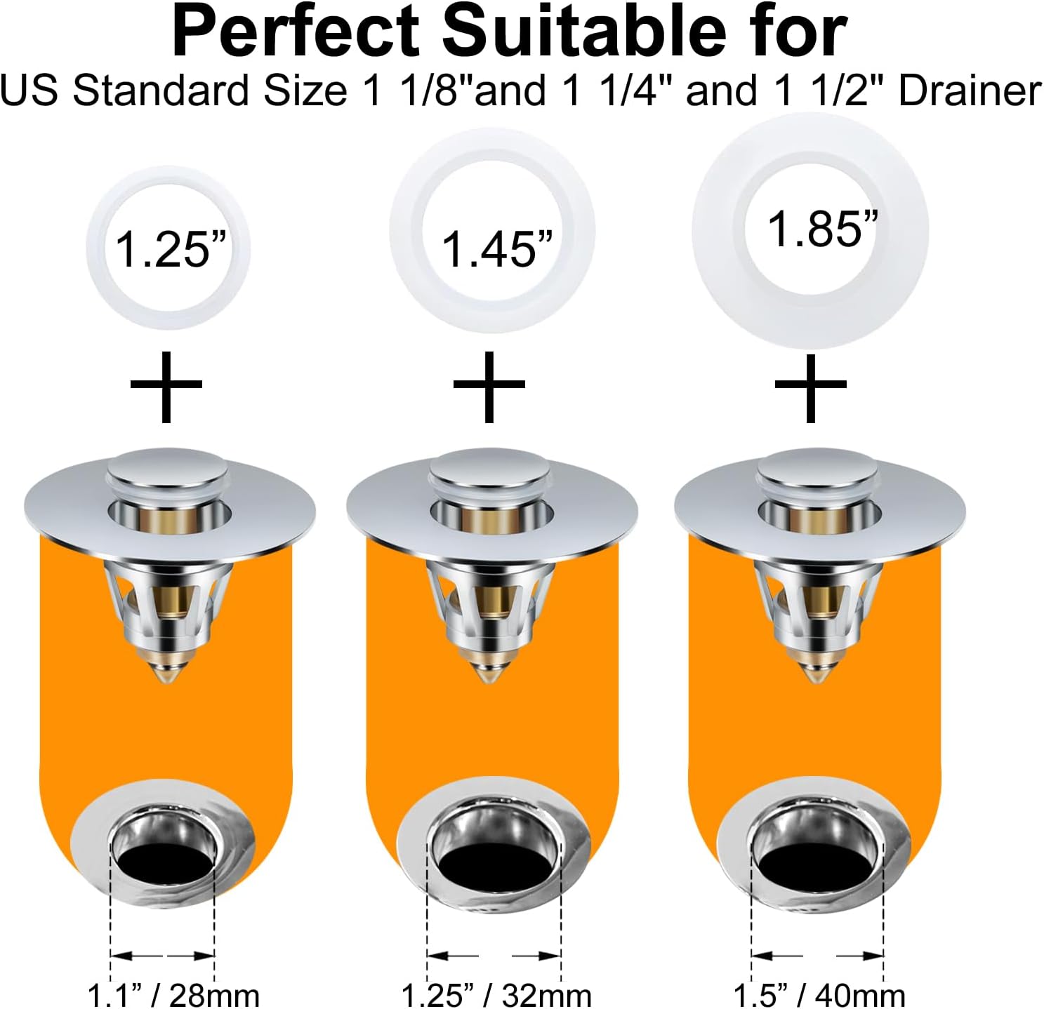 - [Universal Fit] Includes three silicone rings (1.1”, 1.45”, 1.85”) to fit any standard sink drain, ideal for washbasins and bathroom sinks drain. This universal pop up bathroom sink stopper is recommended to measure the sink drain hole beforehand.