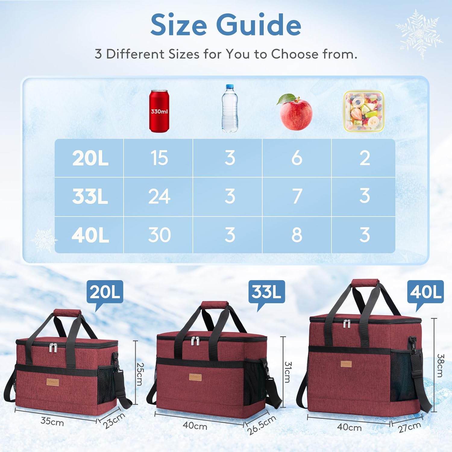 - Measurements: The cooler bag can hold up to 20 Liters (5.3 gallons) by volume; The overall dimensions of the lunch bag are 13.7"(35cm) Γ 9"(23cm) Γ 9.8"(25cm)