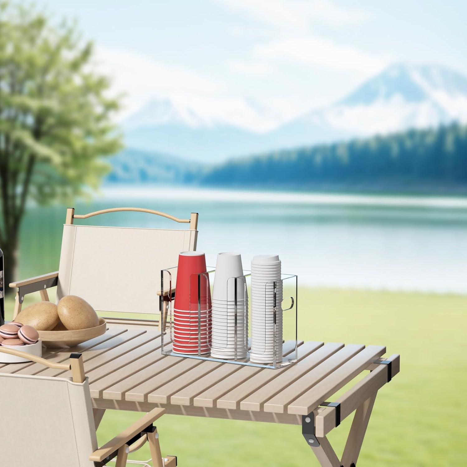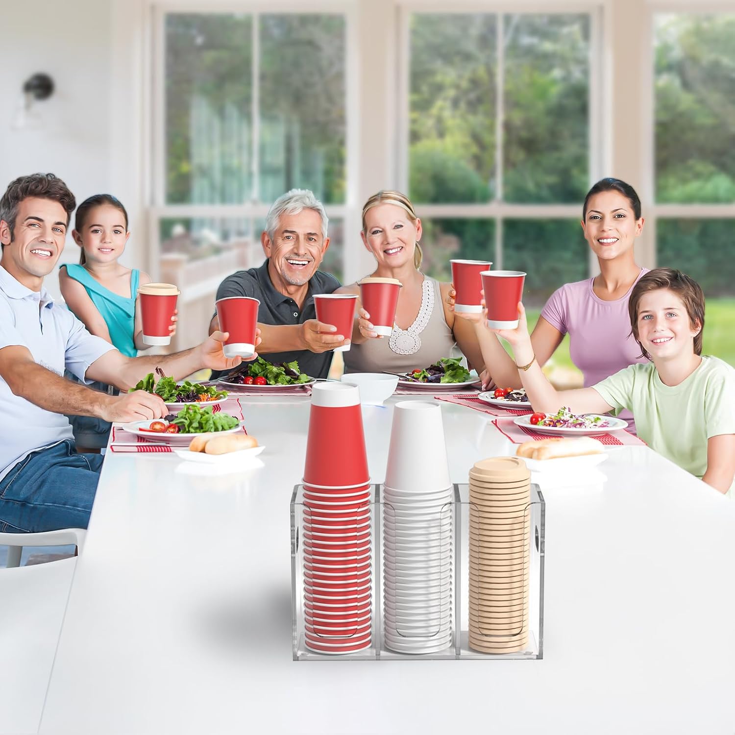 WINFFOR Disposable Cup Organizer Dispenser - 3 Compartments Clear Acrylic Cup and Lid Holder with Handles Plastic Cup Dispenser Countertop Paper Cup Holder for Coffee Bar House Party Essentials