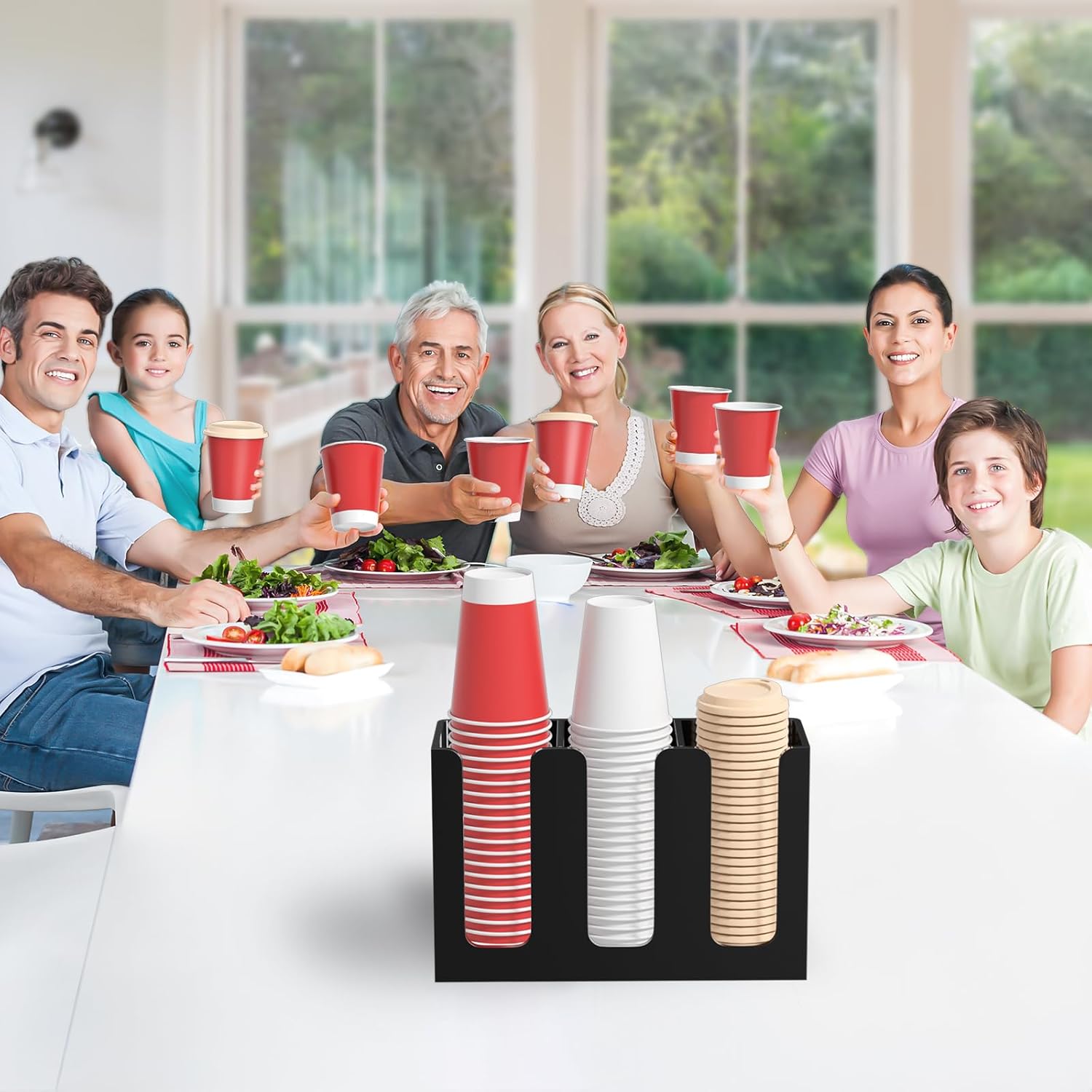 WINFFOR Disposable Cup Organizer Dispenser - 3 Compartments Black Acrylic Cup and Lid Holder with Handles Plastic Cup Dispenser Countertop Paper Cup Holder for Coffee Bar House Party Essentials