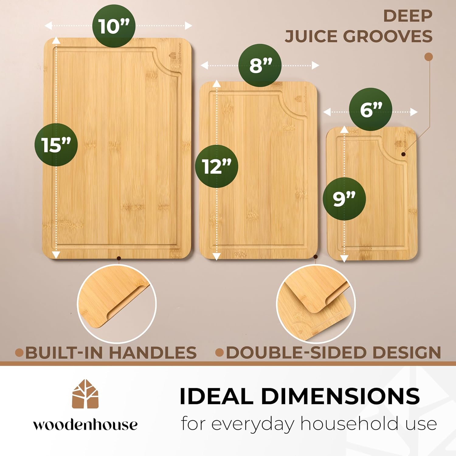 - SET OF 3 SIZES FOR VERSATILITY – This cutting board set includes three sizes: 15”x10”, 12”x8”, and 9”x6”. Ideal for every task, from slicing bread to preparing large meals, these wood cutting boards for kitchen suit all cooking styles.