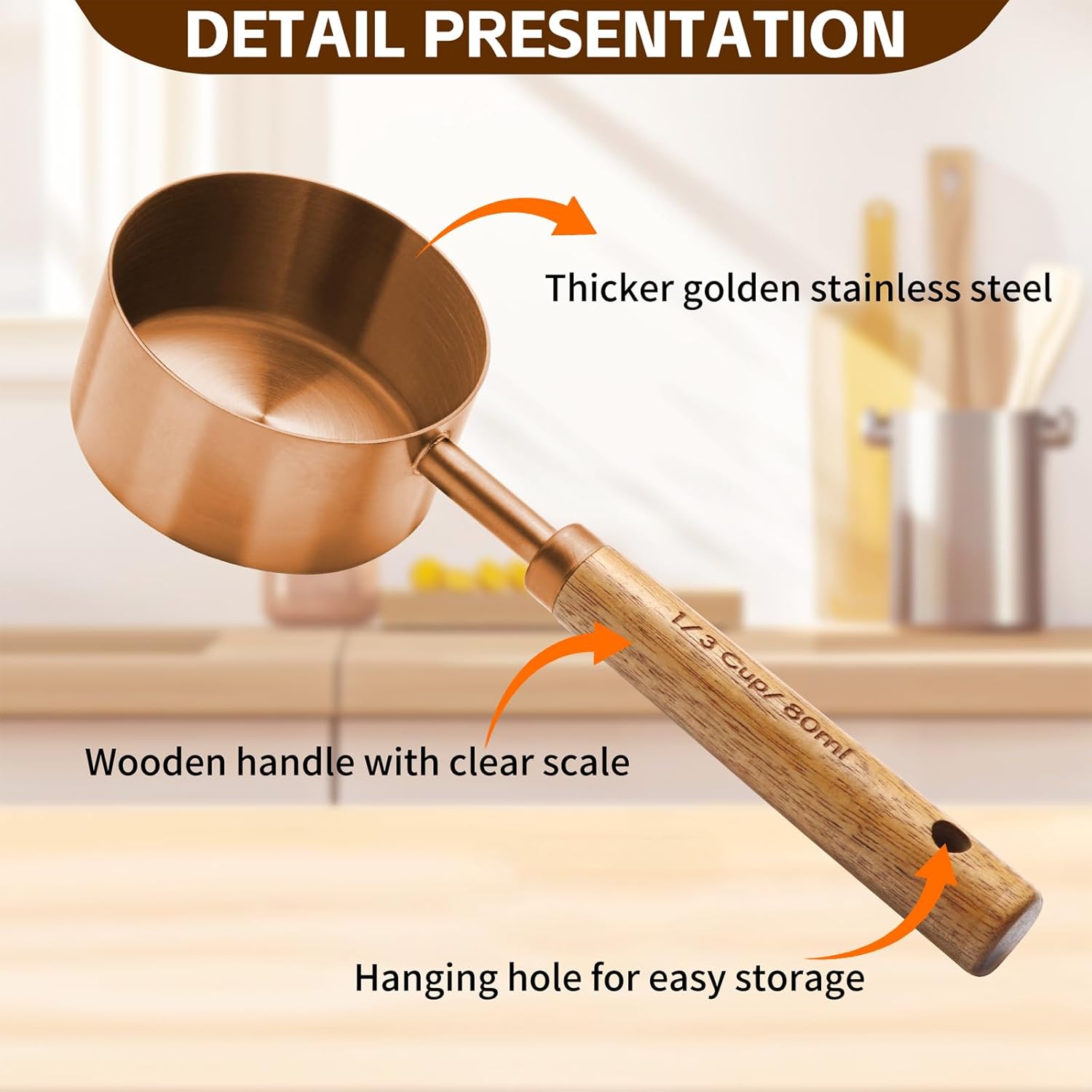 - 【Premium Handle Quality】The measuring cups set handle crafted from high-quality wood with meticulous grinding for a comfortable and anti-slip grip. The scale on the handle enhances visibility, making it easier to measure liquid or dry ingredient volumes.