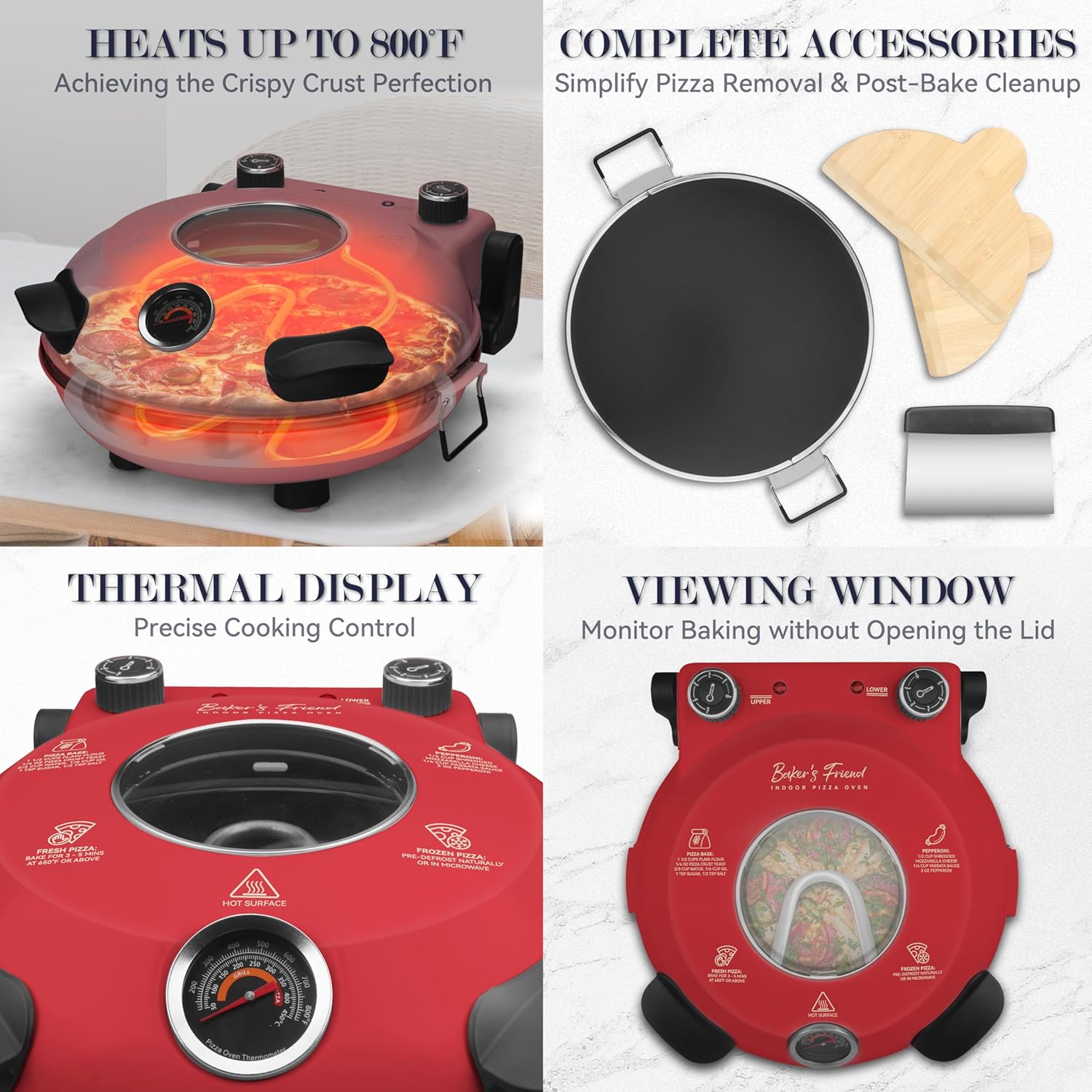 - [Intuitive Controls & Clear Viewing Window]: Equipped with 2 control knobs for adjusting the temperatures of the upper and lower heating elements. Tailor the settings to your cooking preferences. Plus, the large viewing window on top lets you monitor your pizza's progress at a glance. An integrated temperature gauge displays the exact temperature, enhancing your control over the baking process.