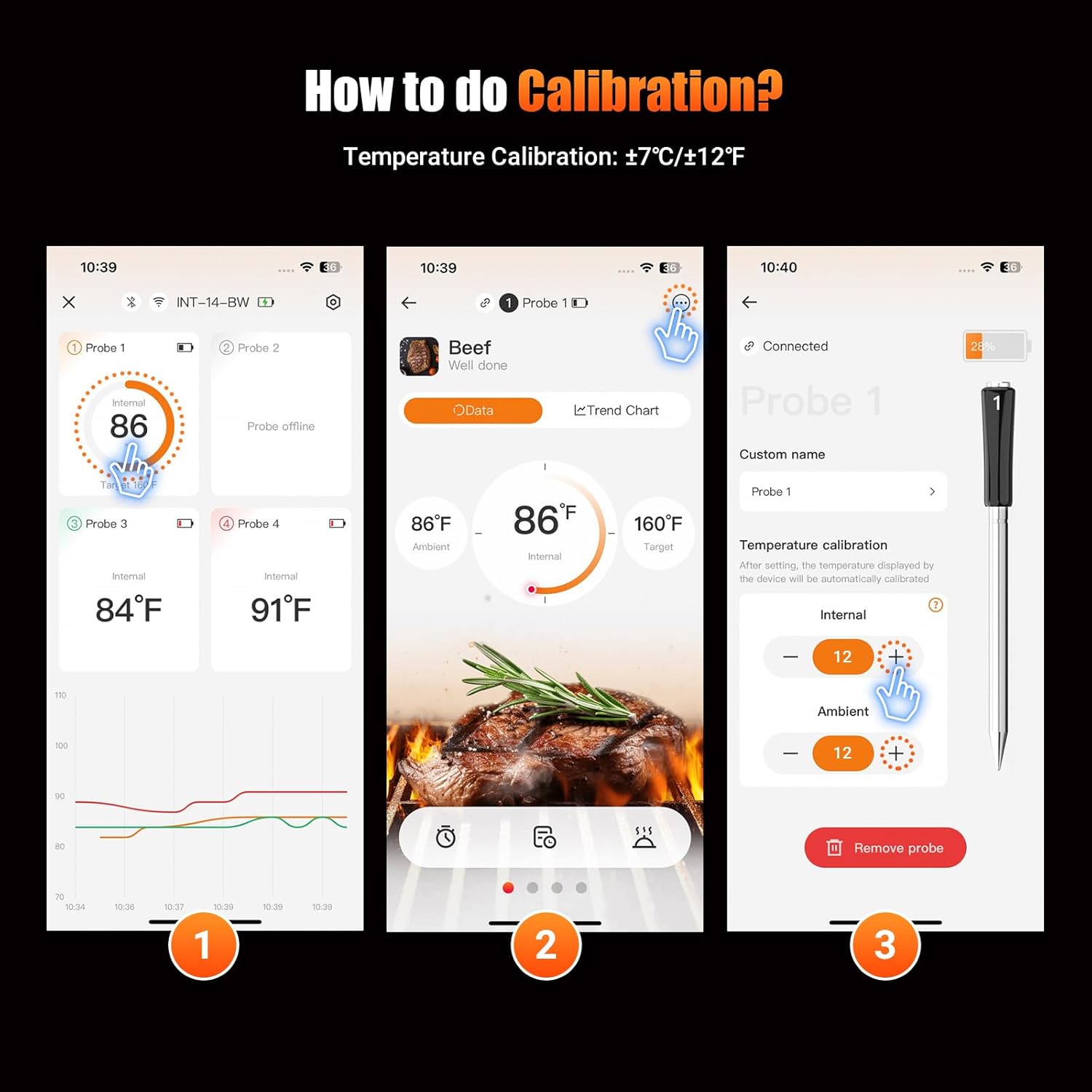 - Calibration±12℉ To Make Sure Correct Temperature: Please remember do calibration when temperature is off when using. That make sure always get correct reading. The internal temperature range is from 14~212℉, while the cooking environment temperature range is from 32~572℉. Each probe has an amazingly high measurement accuracy of ±1.8℉, which is perfect for helping you control the food temperature precisely at what you want.(NOTE: It's important to keep all probes within 19.68ft of the base for a stable connection. Plus, make sure you insert each probe deep enough and beyond the safe cooking line for the best results)
