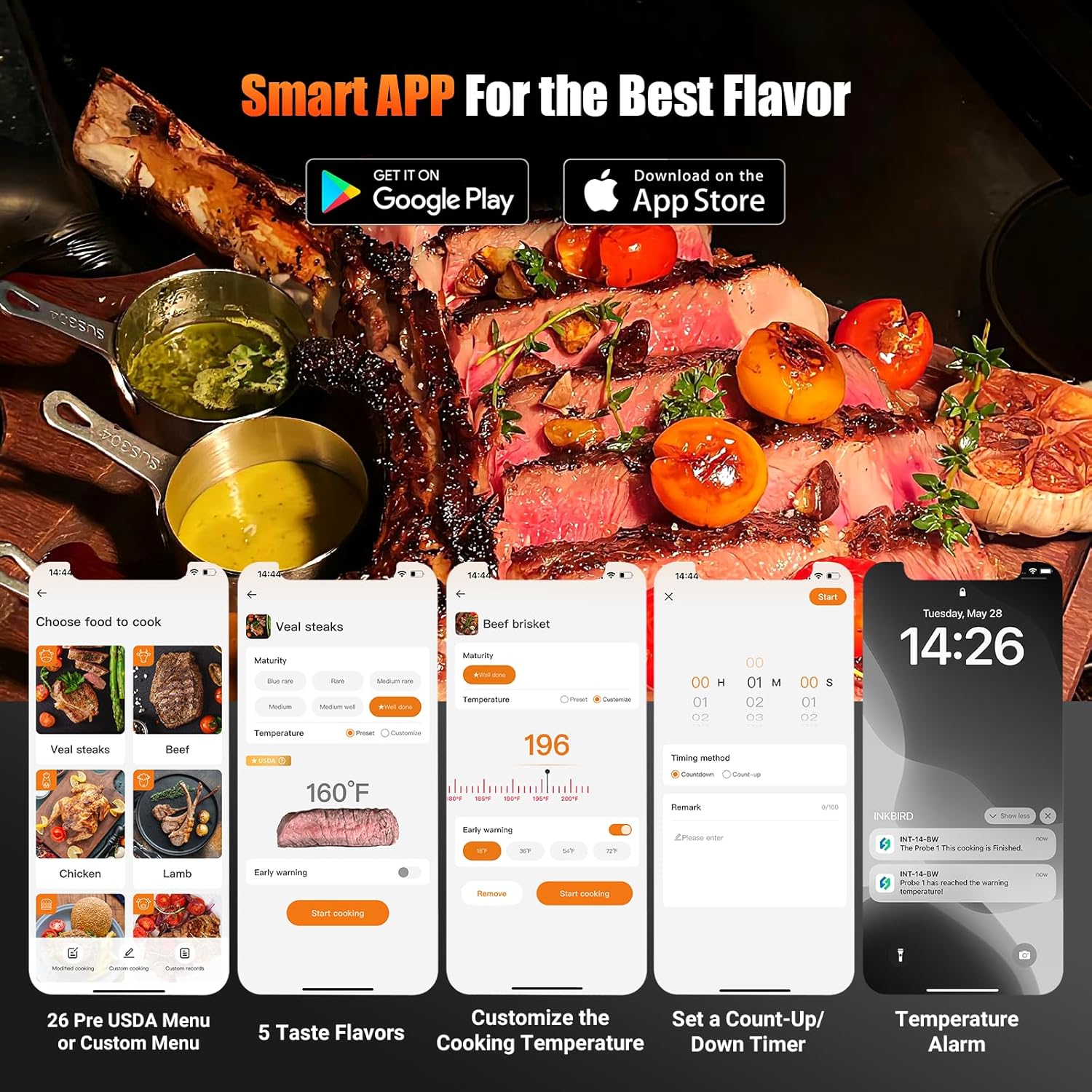 - Smart Cooking + 30min Offline Data Storage: The INKBIRD app includes 26 meat menus with USDA-recommended meat cooking temperatures to let you create a cooking program with ease. You can also customize the cooking temperature and set a count-up/down timer, and with the use of temperature alarms, you can easily create five-star delicacies. Plus, the temperature pre-alarm function give you enough time to prepare before the cooking is complete so that you can enjoy the food at its best taste condition. In addition, the device itself can store 30 minutes of offline temperature data and sync with the app via wireless connection, so you can see all temperature data in the history graph